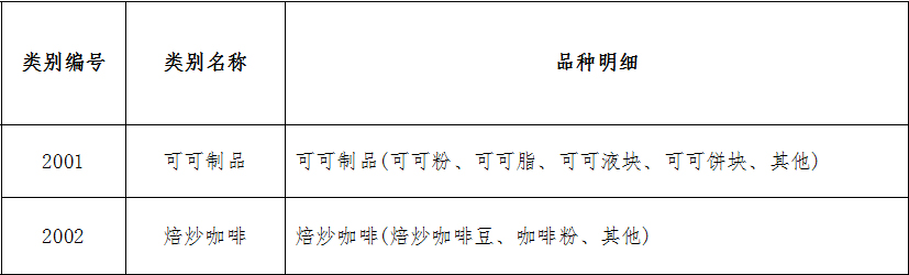 可可及焙烤咖啡產品類別編號及類別名稱:2001可可制品2002焙炒咖啡