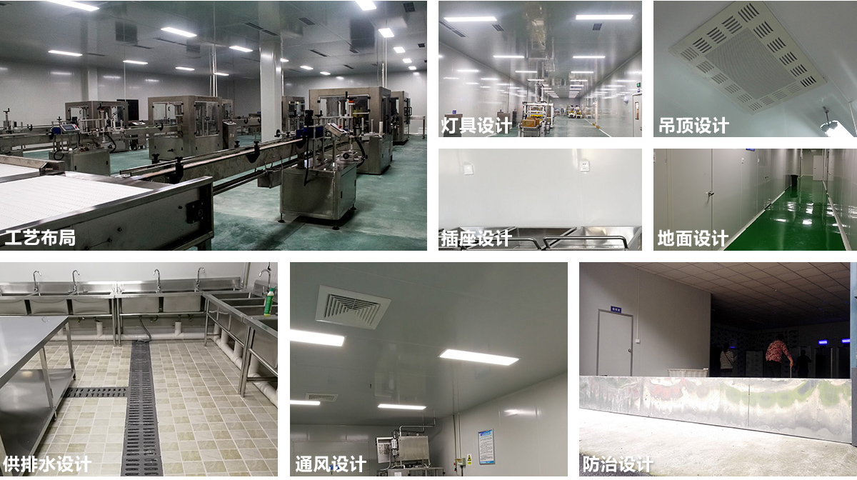 食品工廠設(shè)計包括:工藝布局(車間設(shè)計)、供排水設(shè)計、燈具(照明)設(shè)計、插座設(shè)計、吊頂設(shè)計、地面設(shè)計、通風(fēng)設(shè)計、防治設(shè)計
