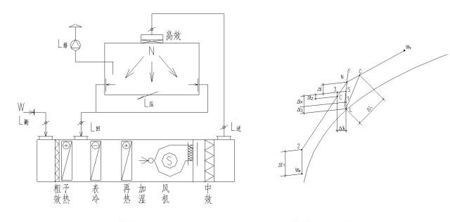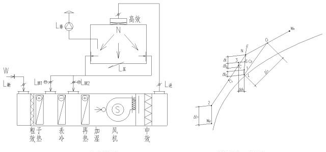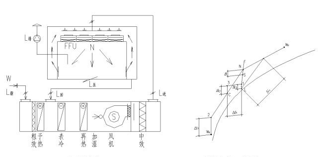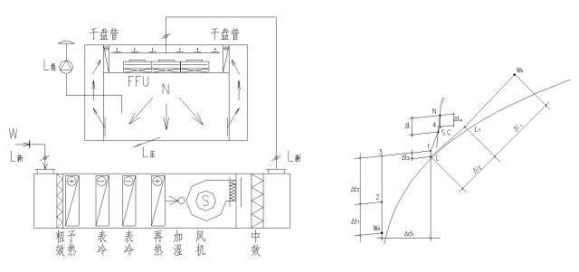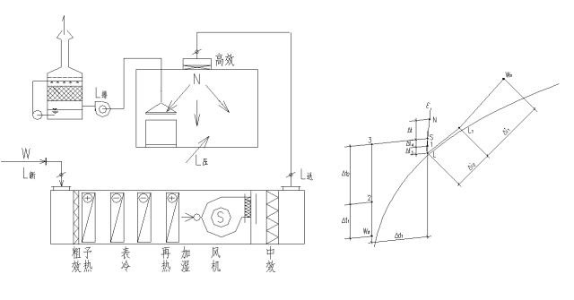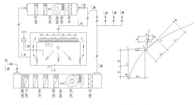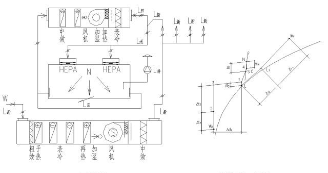 為了節(jié)能、消除空氣熱濕處理過(guò)程中的冷熱相互抵消,在潔凈室凈化送風(fēng)量大于消除余熱、余濕的空調(diào)送風(fēng)量時(shí),最好采用一、二次回風(fēng)方案,將二次混合點(diǎn)設(shè)計(jì)在系統(tǒng)送風(fēng)點(diǎn)上,該方是最節(jié)能、最經(jīng)濟(jì)的送風(fēng)方案。其原理圖和焓濕圖如下: