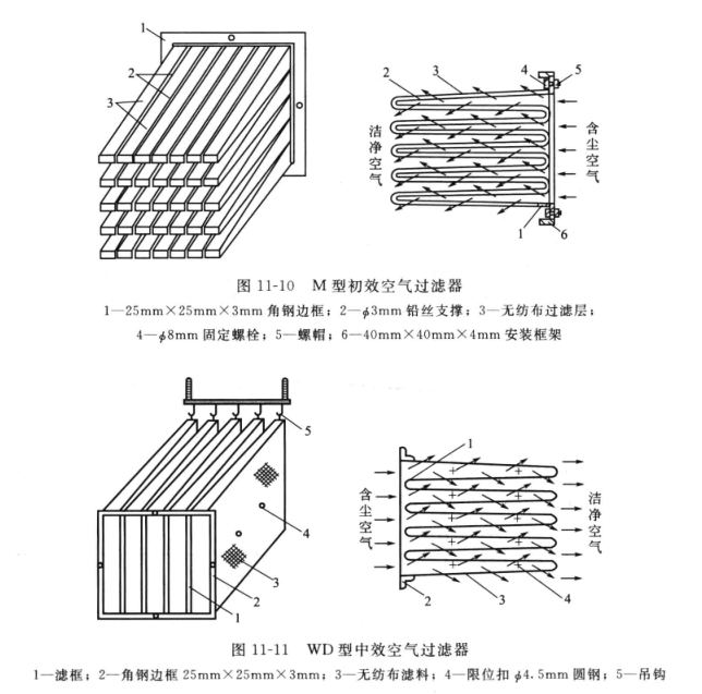 初效過濾器常用作凈化空調(diào)系統(tǒng)的一級過濾器,用于新風(fēng)過濾,以濾除粒徑大于10μm的塵粒和各種異物,并起到保護中、高效過濾器的作用。此外,初效過濾器也可單獨使用。常用的M型初效空氣過濾器的結(jié)構(gòu)如圖11-10所示。