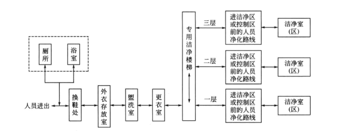 對于多層潔凈廠房,衛生通道與潔凈室常采用分層布置。通常是將換鞋處、外衣存放室、淋浴室、換內衣室布置在底層,然后通過潔凈樓梯至有關各層,依次經過各層的二次更衣室(即穿無菌衣、鞋和手消毒室)、風淋室,再進入潔凈區,如圖1所示。