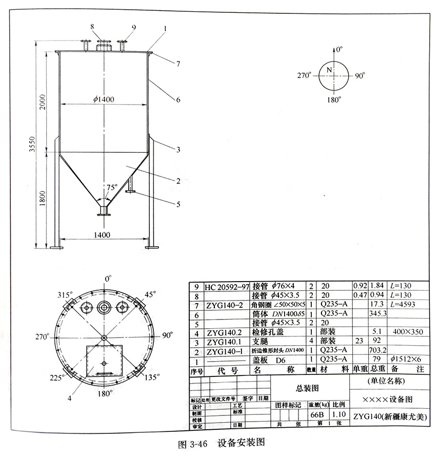 管口方位圖是食品工廠設計制造設備時確定各管口方位、管口與支座、地腳螺栓等相對位置用的,也是設備安裝時確定安裝方位的依據。內容如下: