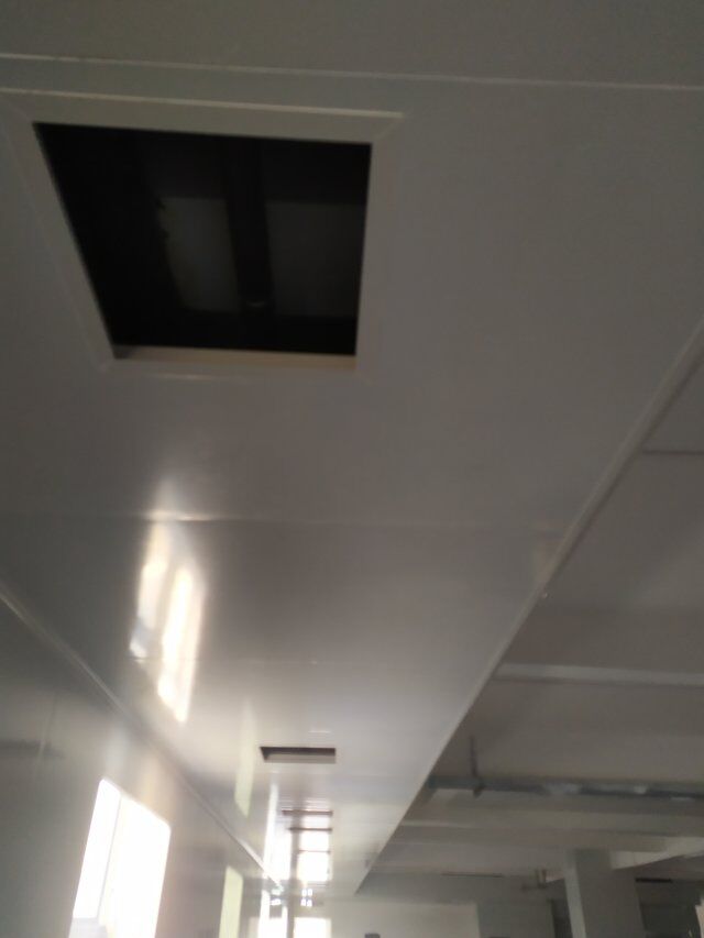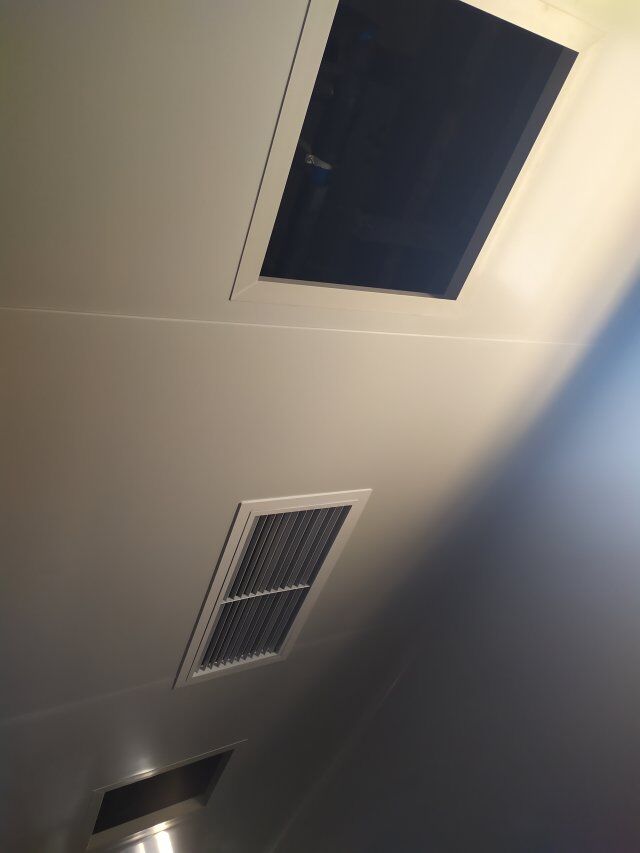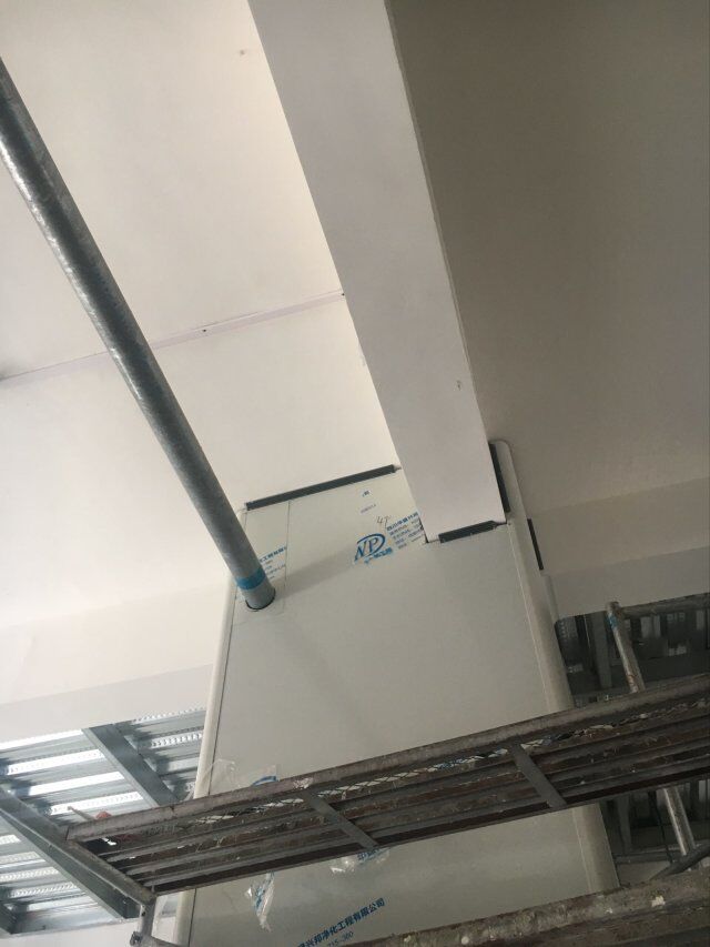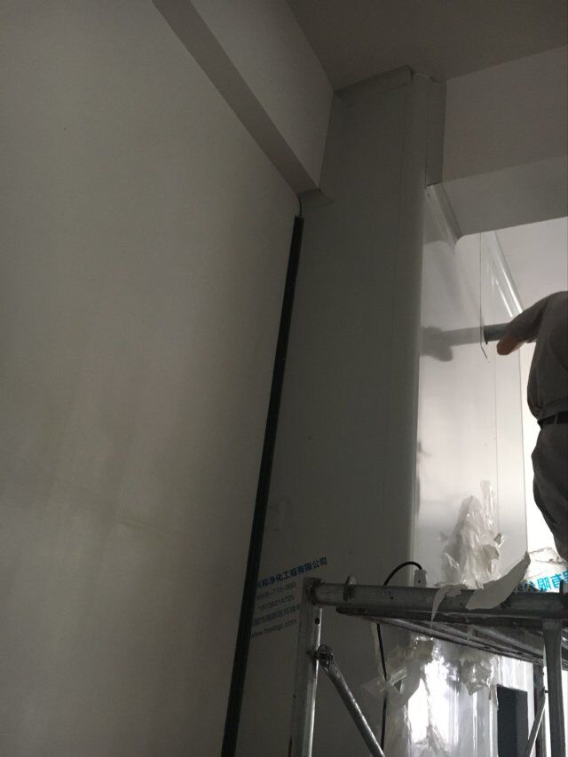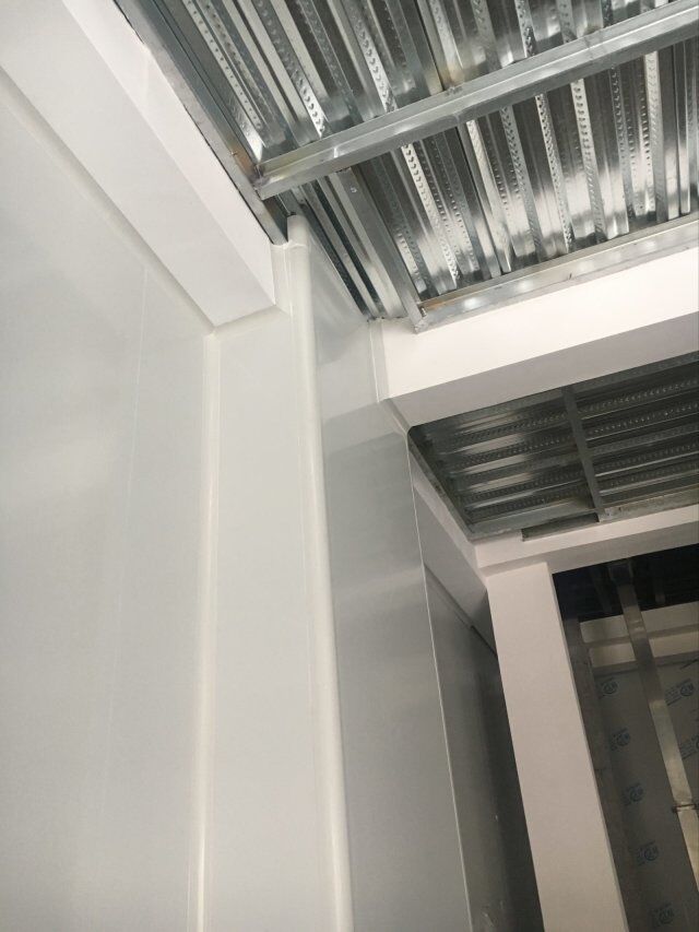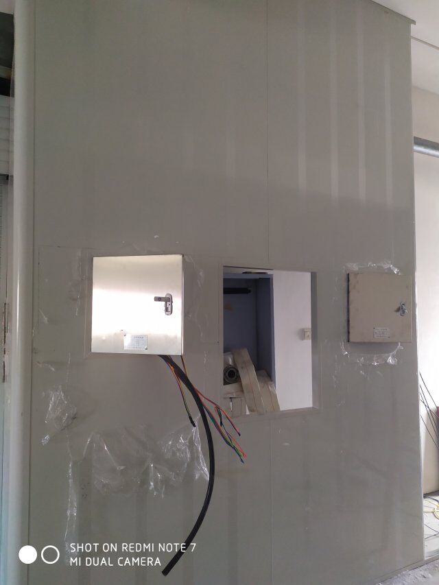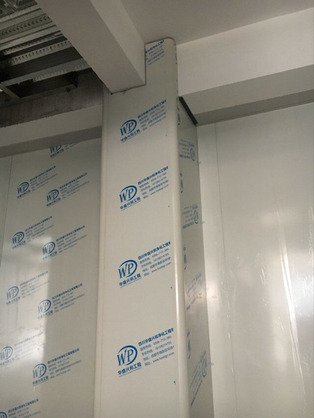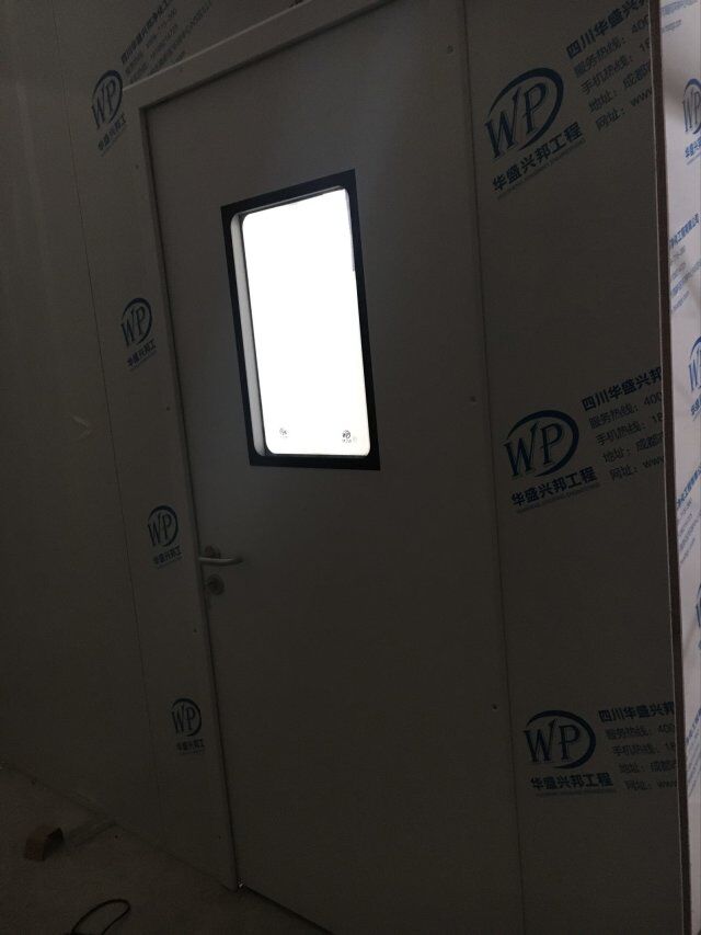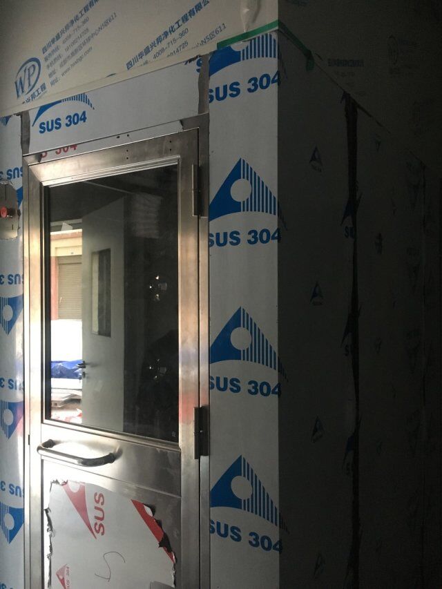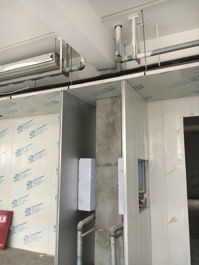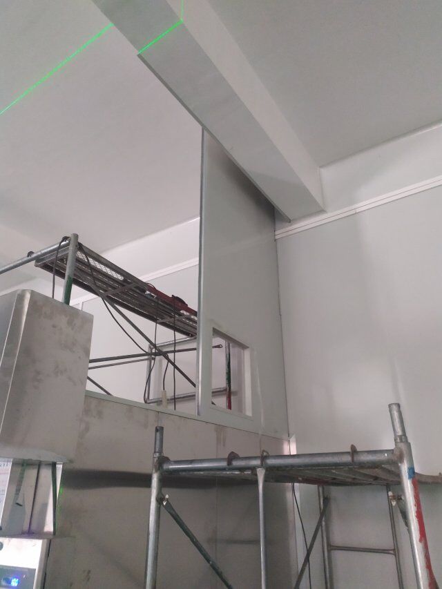 四川美料美味食品科技有限公司廠房裝修現(xiàn)場(chǎng),風(fēng)淋室調(diào)試安裝完成,板材包邊完成