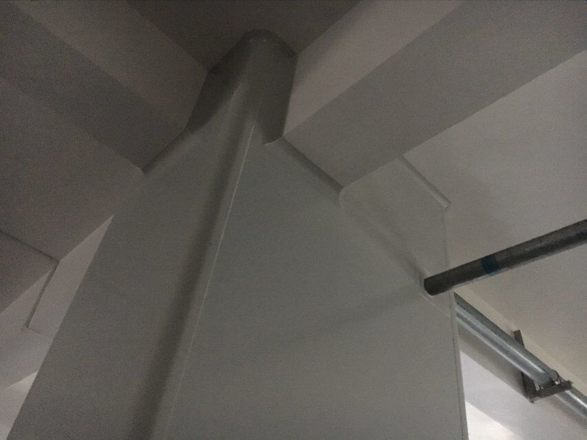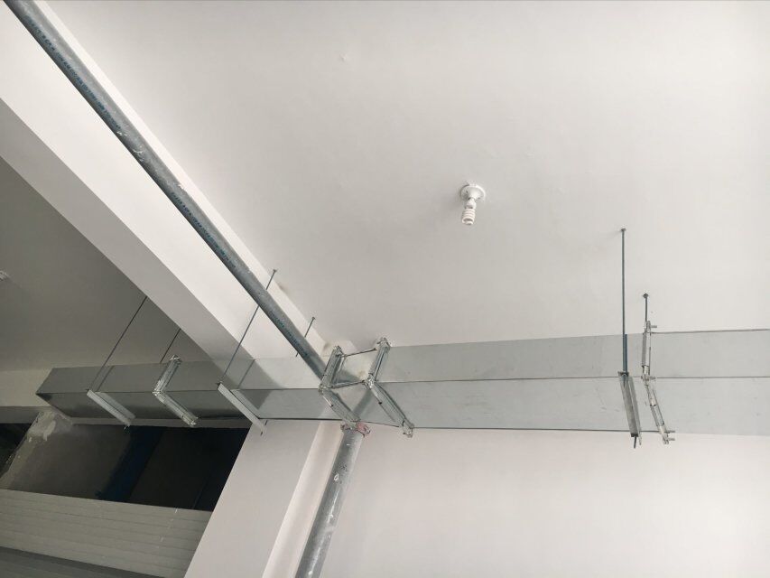 四川美料美味食品科技有限公司廠房裝修現(xiàn)場(chǎng):排風(fēng)口安裝,地坪施工,地面貼磚
