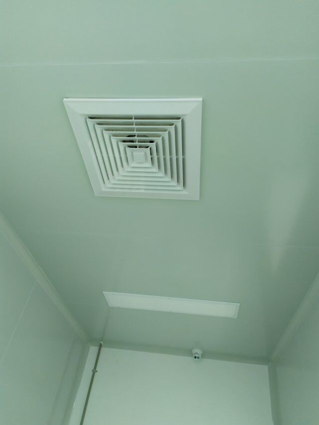 四川美料美味食品科技有限公司廠房裝修現(xiàn)場(chǎng),排風(fēng)扇安裝,衛(wèi)生間裝修完成