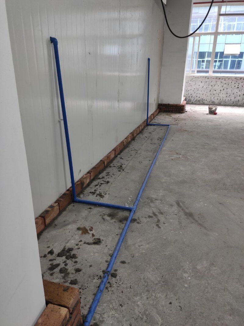 1.排水管安裝完成80% 2.凍庫(kù)擋水墻完成