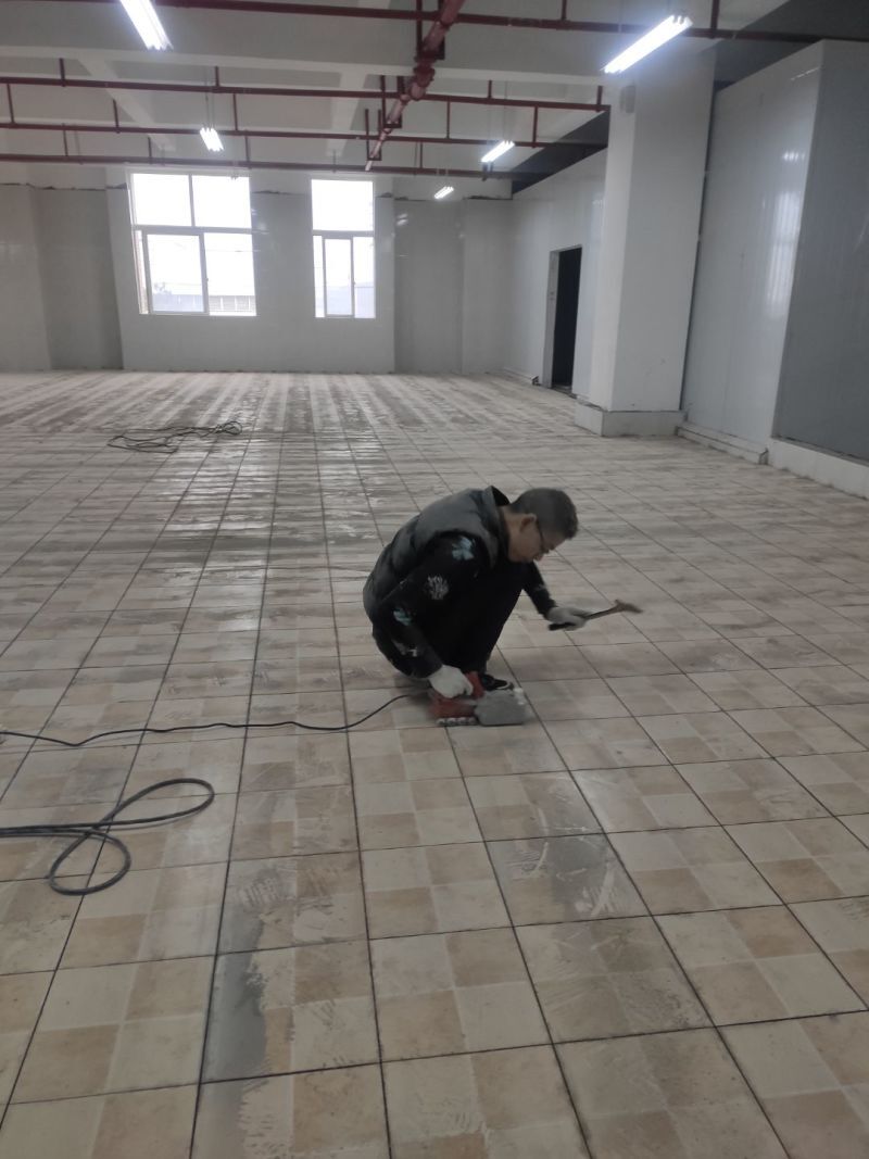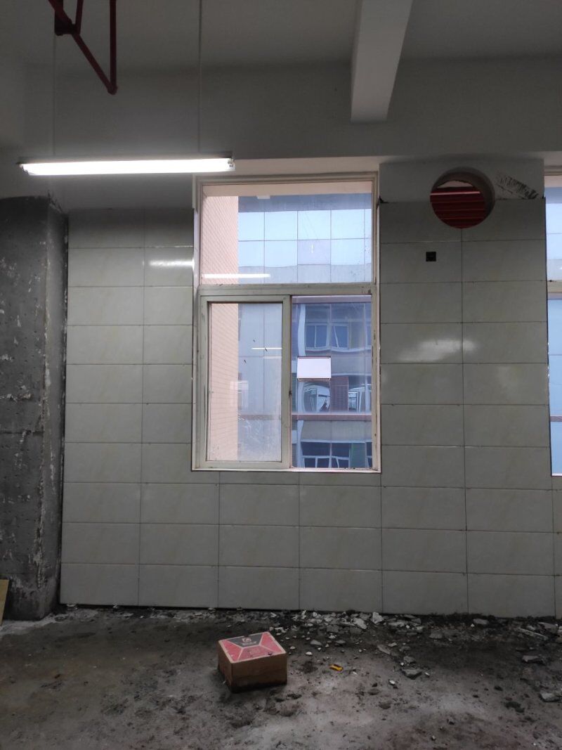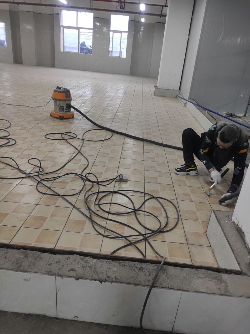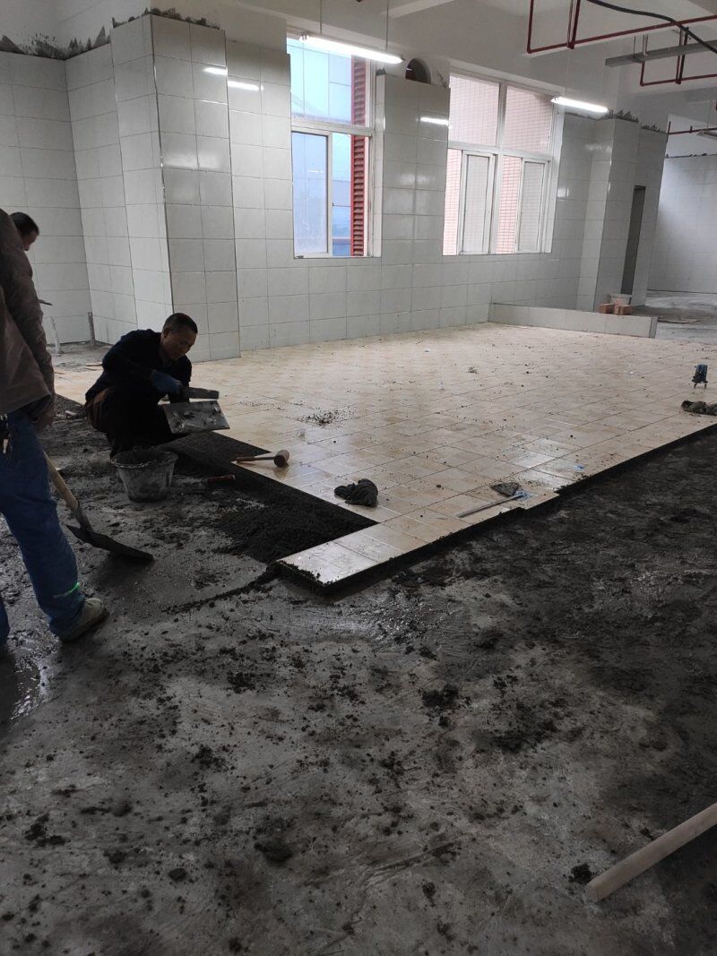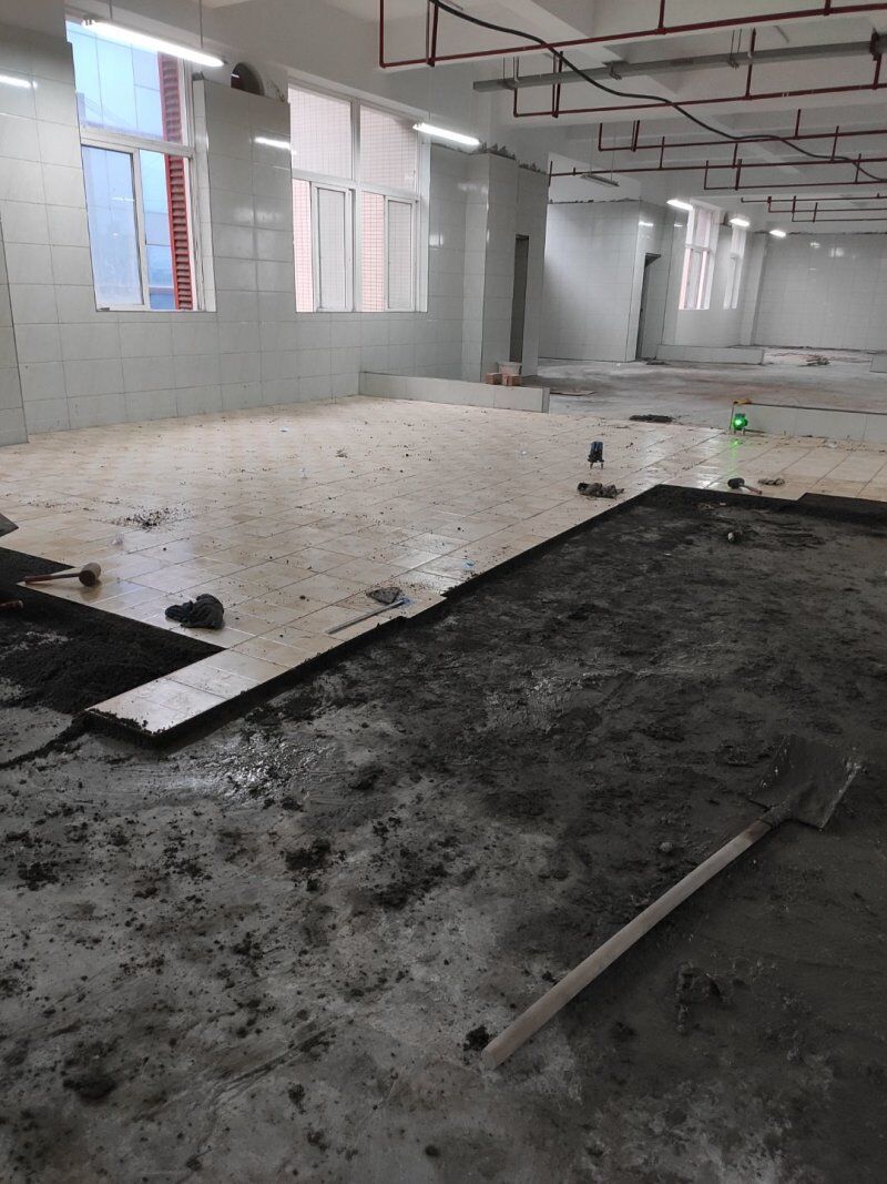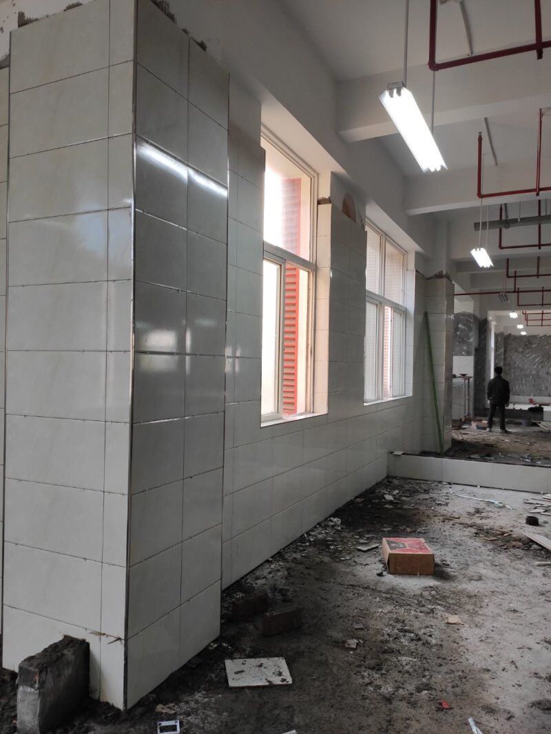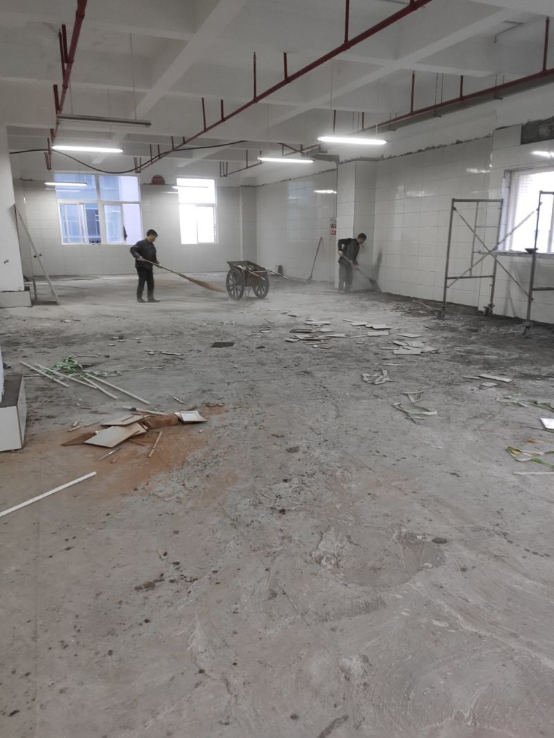 地磚鋪設(shè)完成一半,清洗間墻磚開始施工,車間衛(wèi)生打掃完成