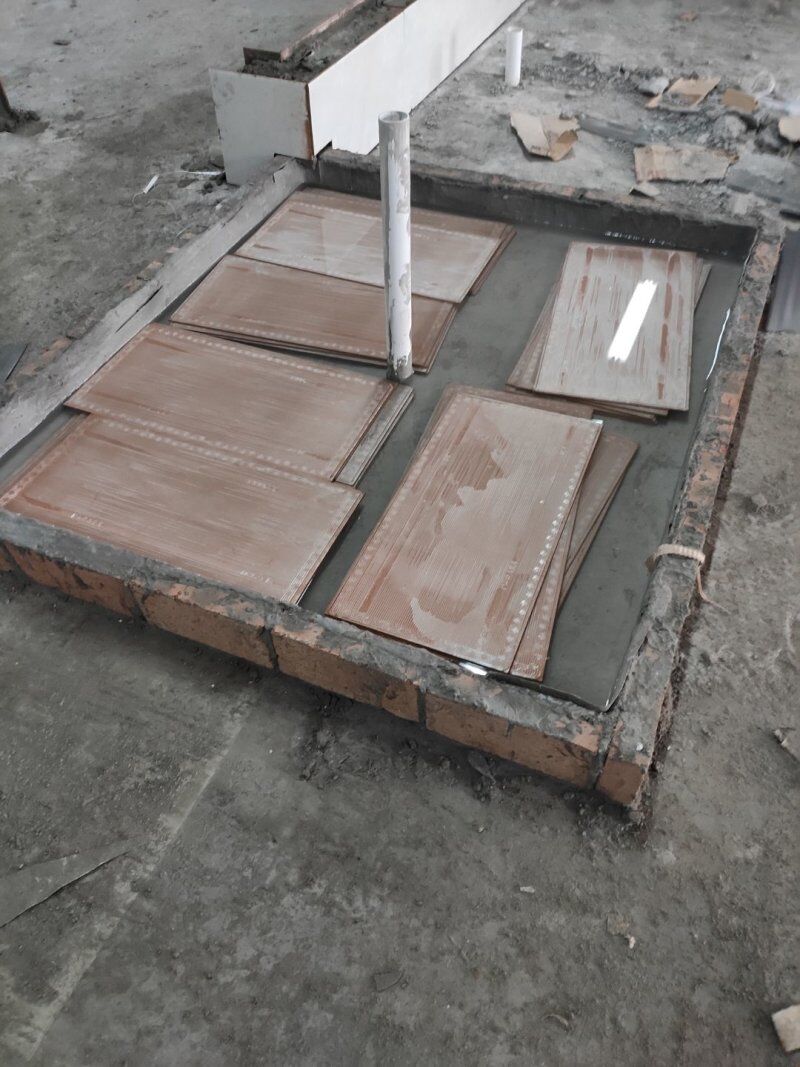 1.墻面貼磚完成 2.擋水墻貼磚完成 3.地面貼磚施工
