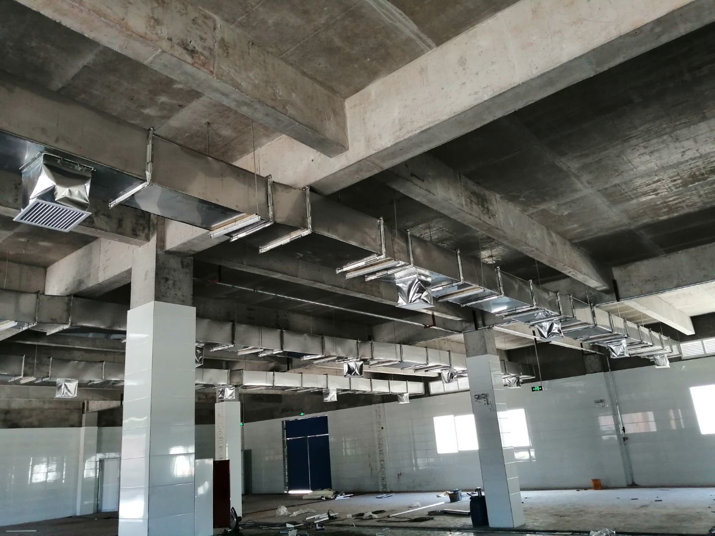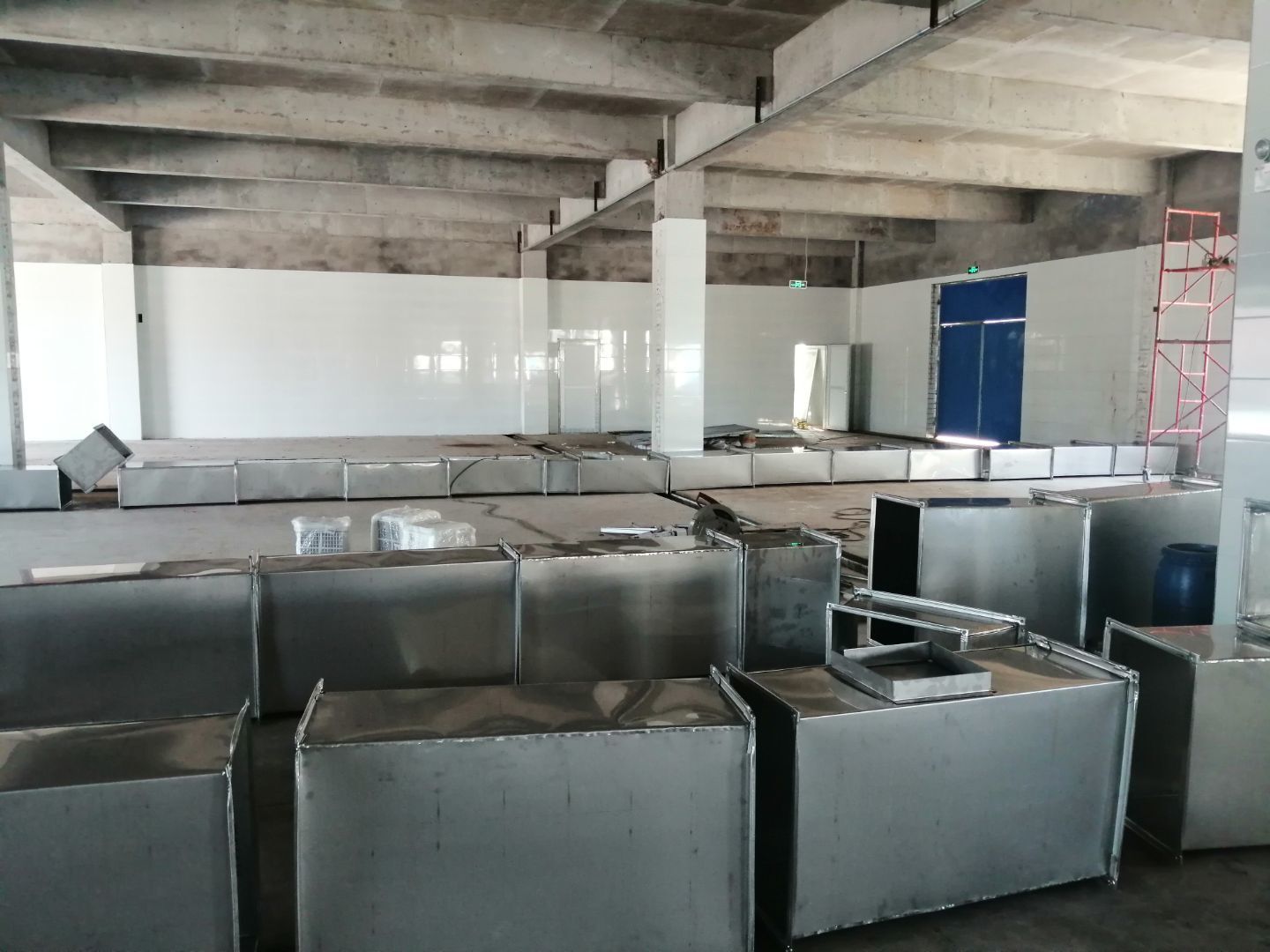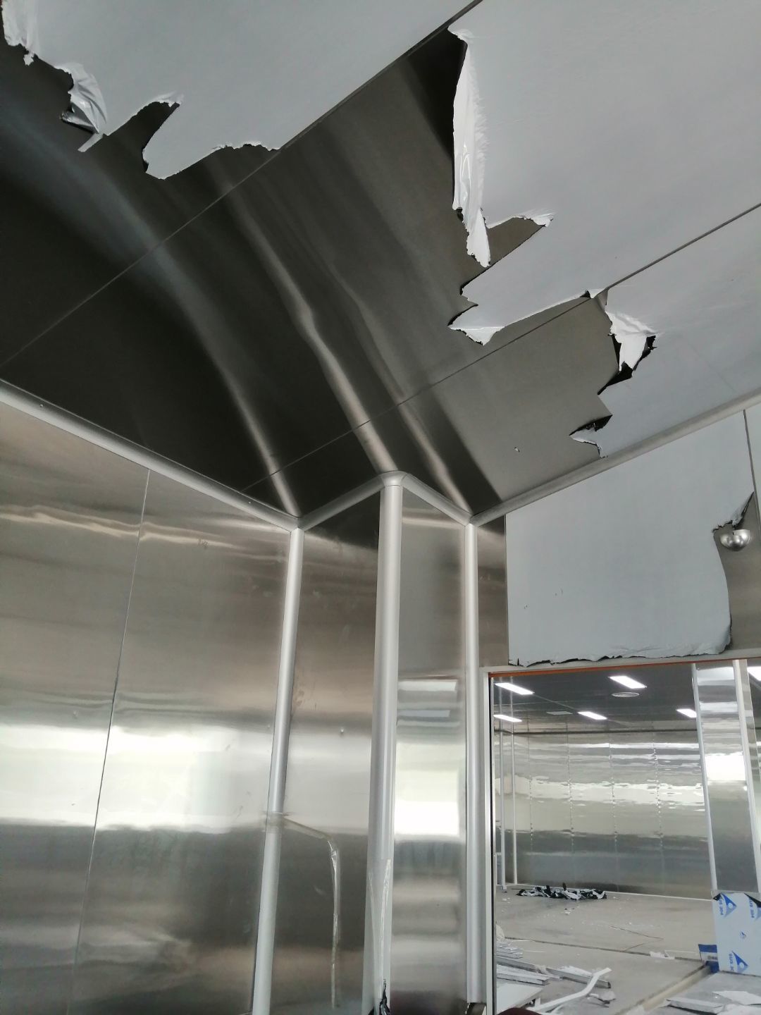 1.風管組裝完成,保溫完成百分之五十 2.彩鋼板開始全面吊頂