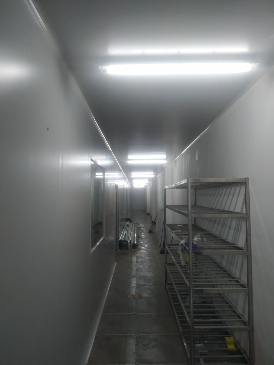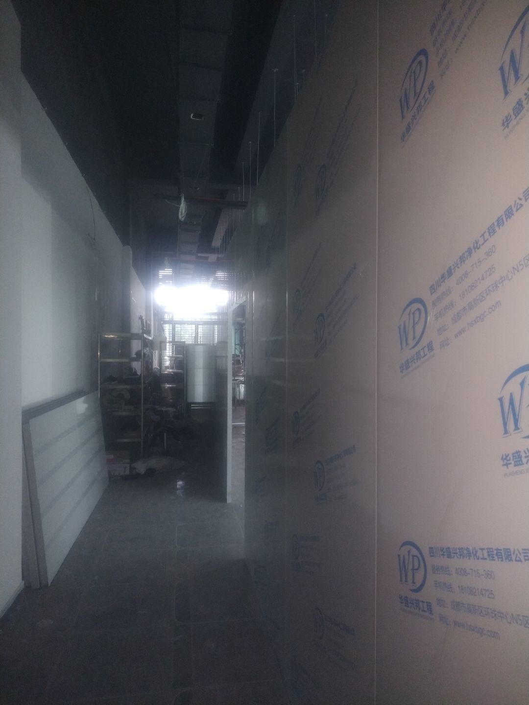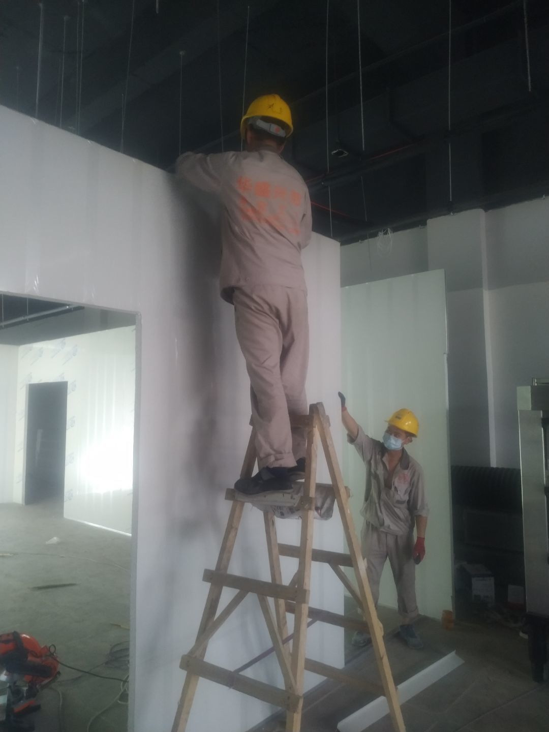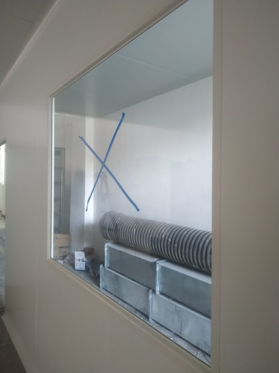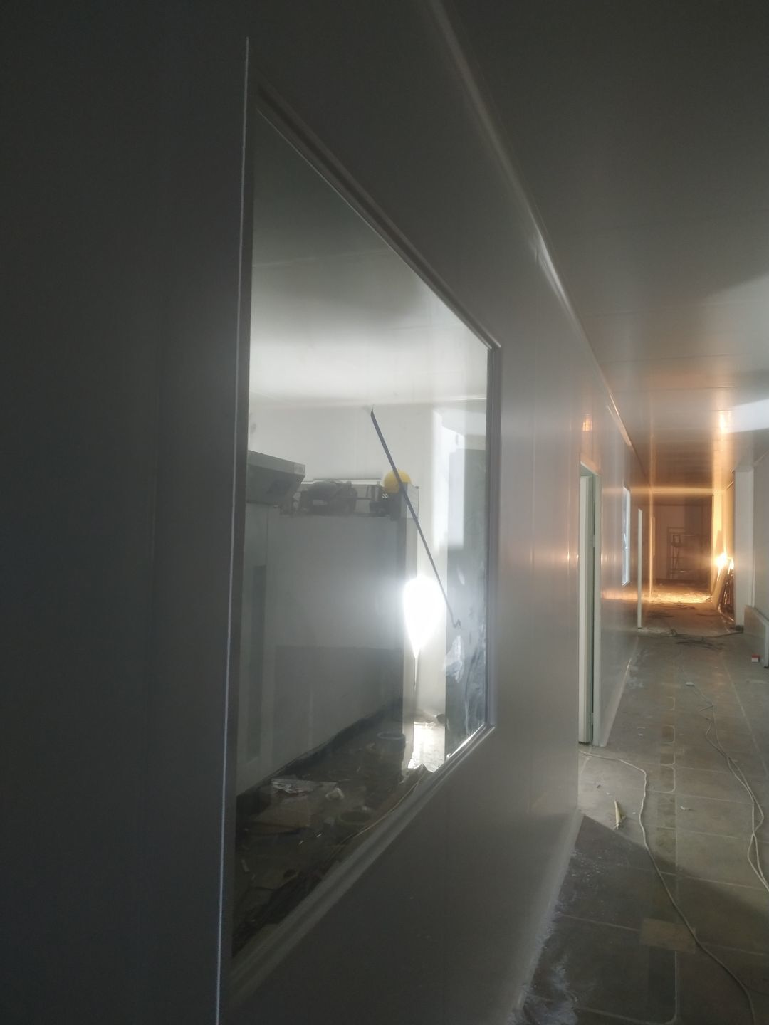 撕膜打膠完成95%,圓弧安裝完成90%,門(mén)安裝完成85%,觀察窗安裝完成,燈具安裝完成80%,配管穿線完成60%。