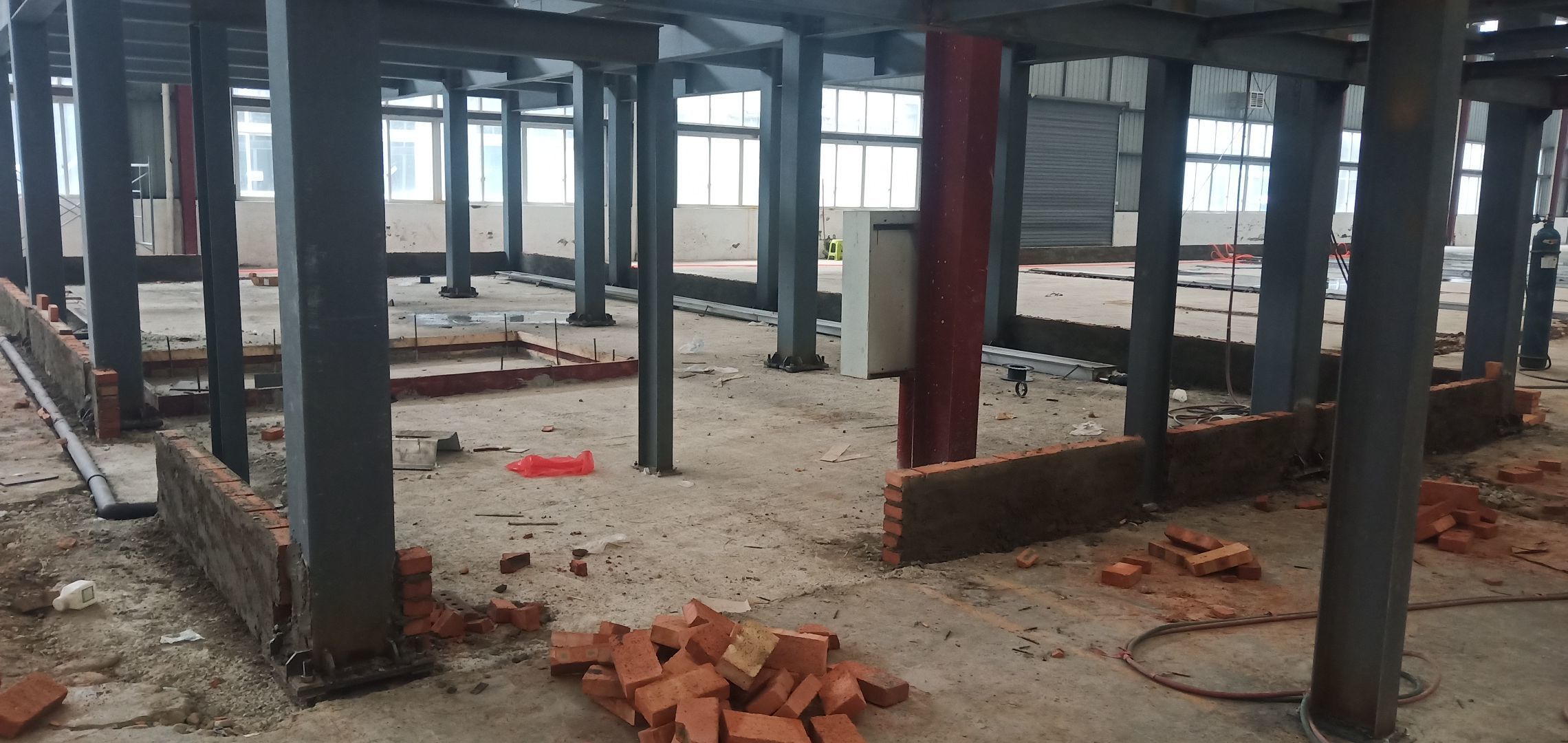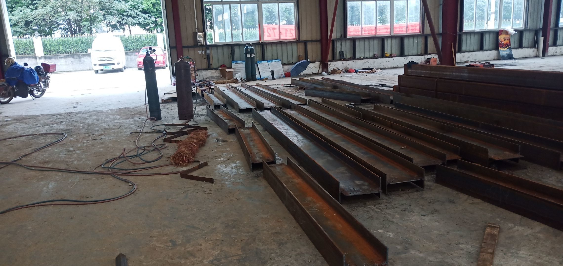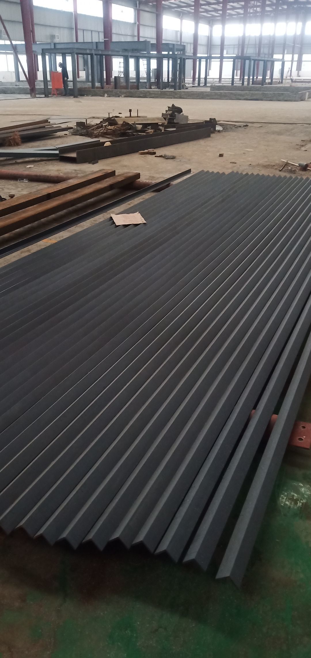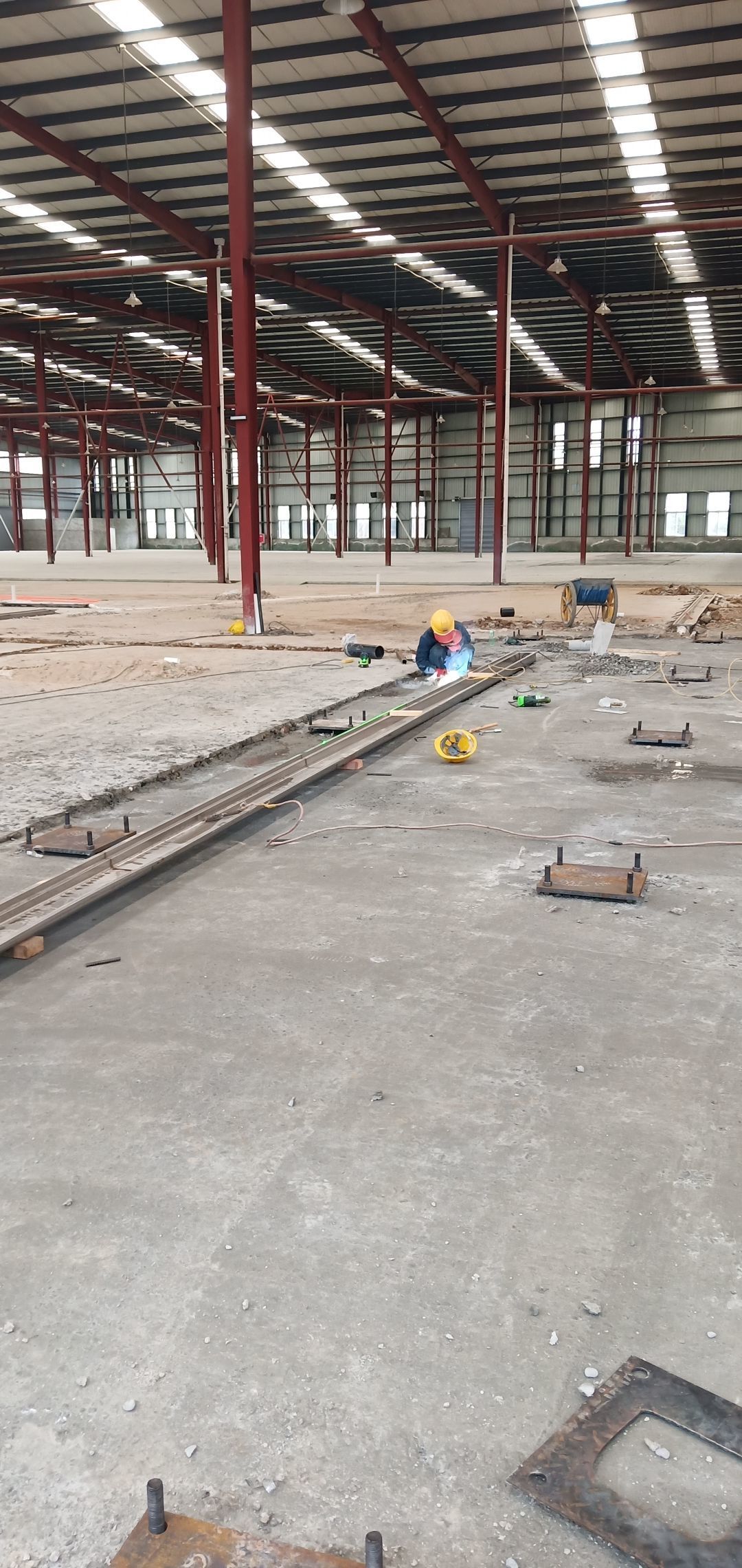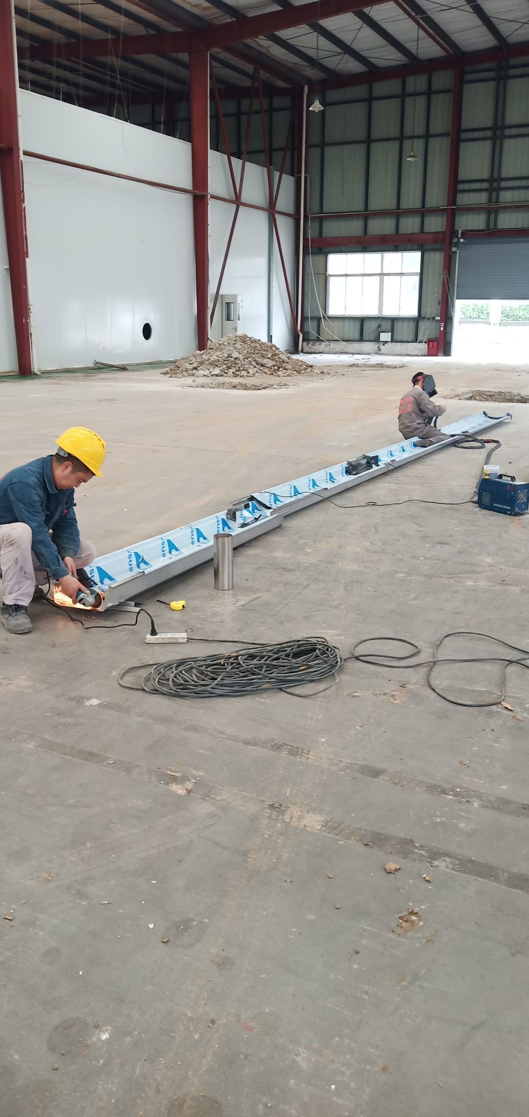 地面找平打點,辦公區槽鋼焊接,角鋼除銹刷防銹漆