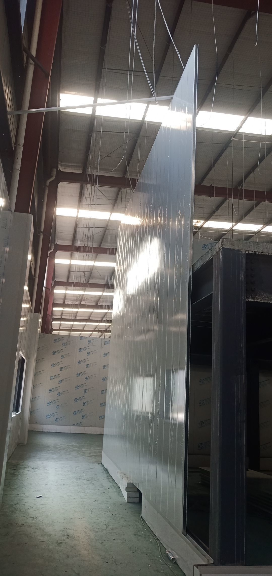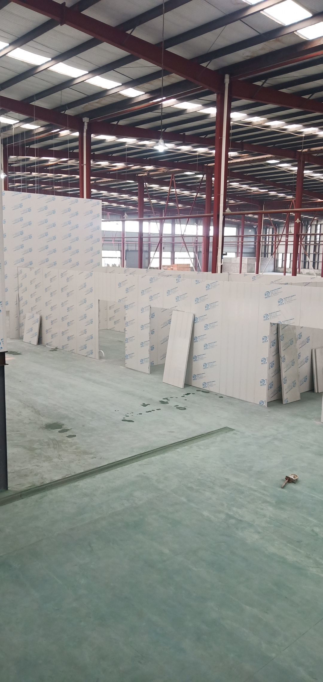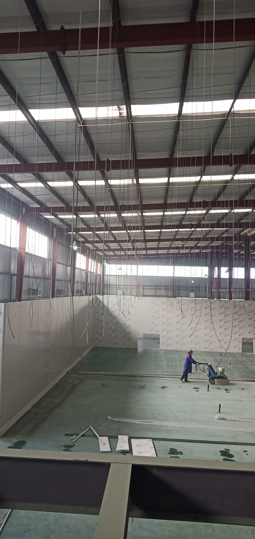 彩鋼墻板完成40%,鋼絲繩完成100%,固化地坪完成60%,鋼結構刷第二次面漆