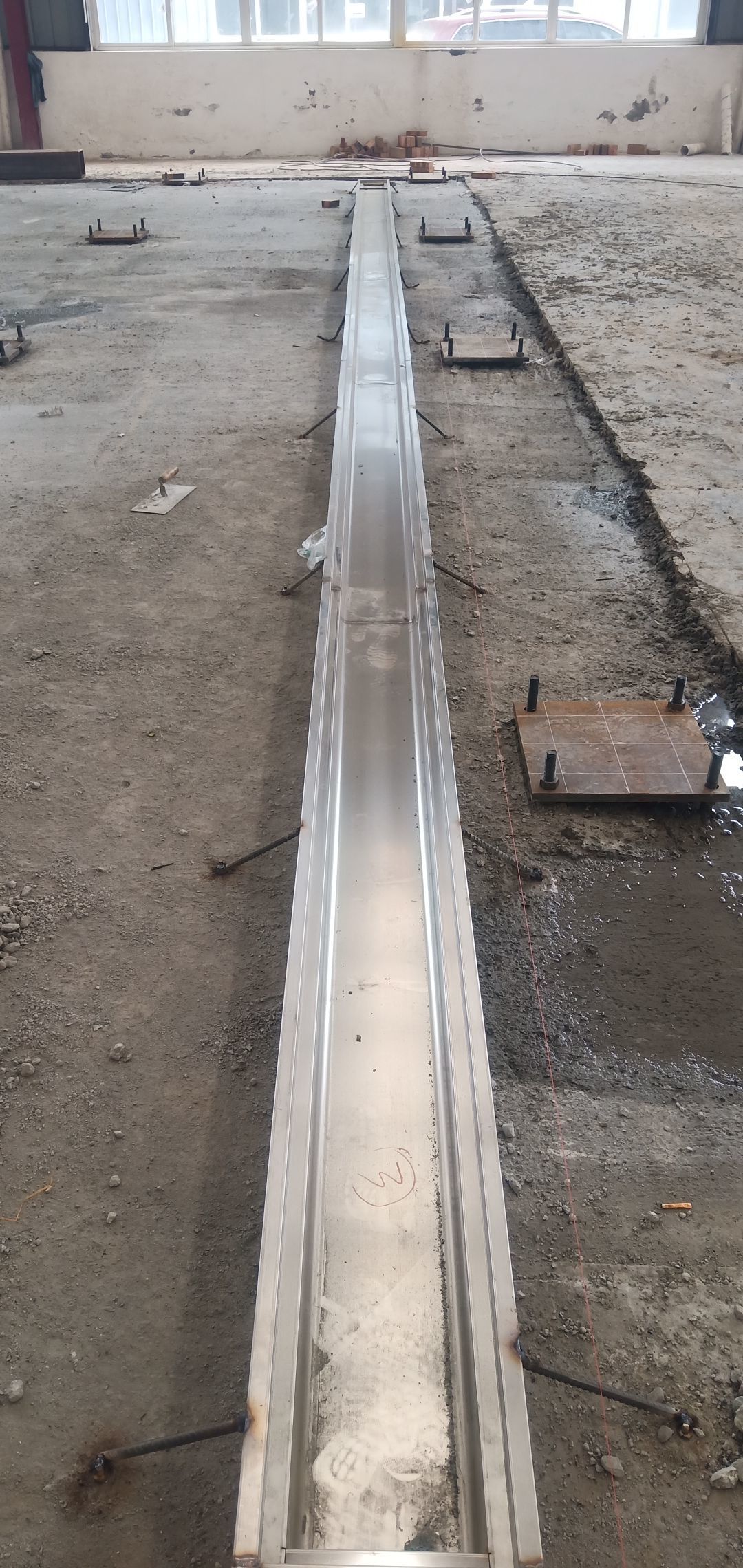 平臺基礎上安裝不銹鋼排水溝,鋼結構柱腳板安裝,鋼梁、鋼柱加工,鋼梁、鋼柱制作完成60%