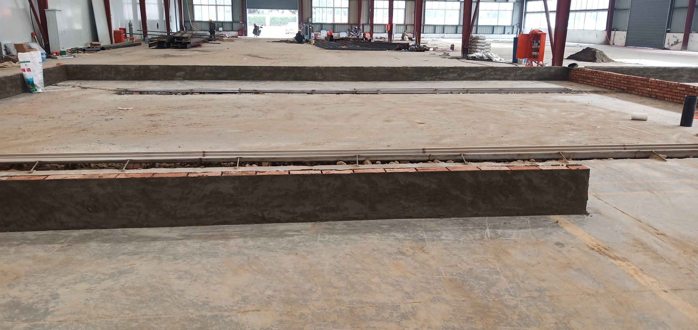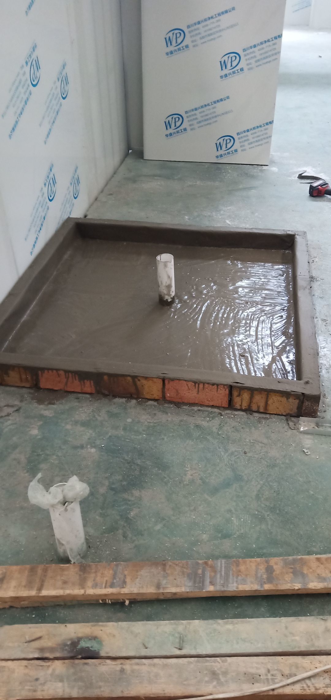 彩鋼板完成70%,固化地面完成95%,擋水墻斜坡完成80%,腳踏池防水完成