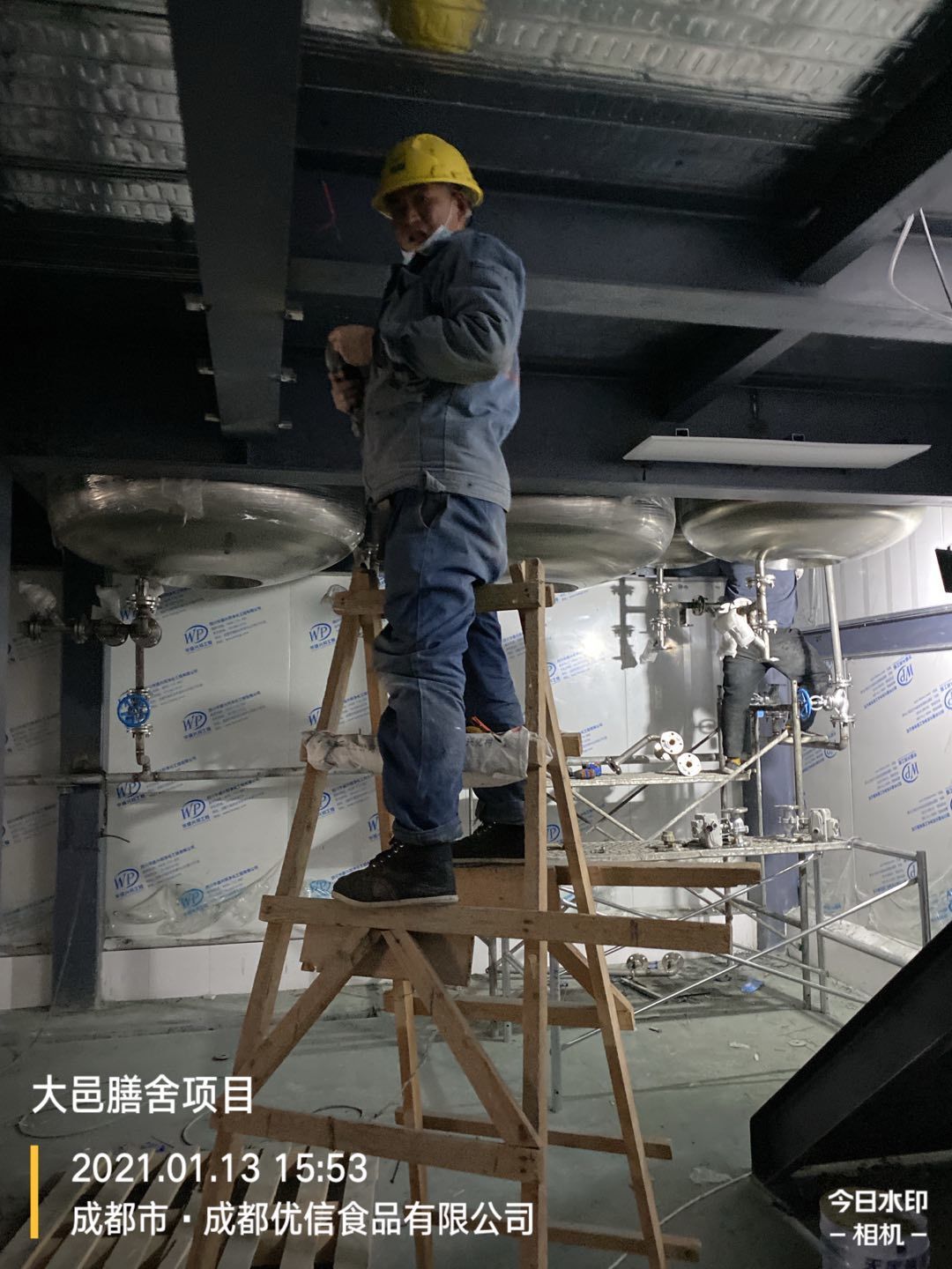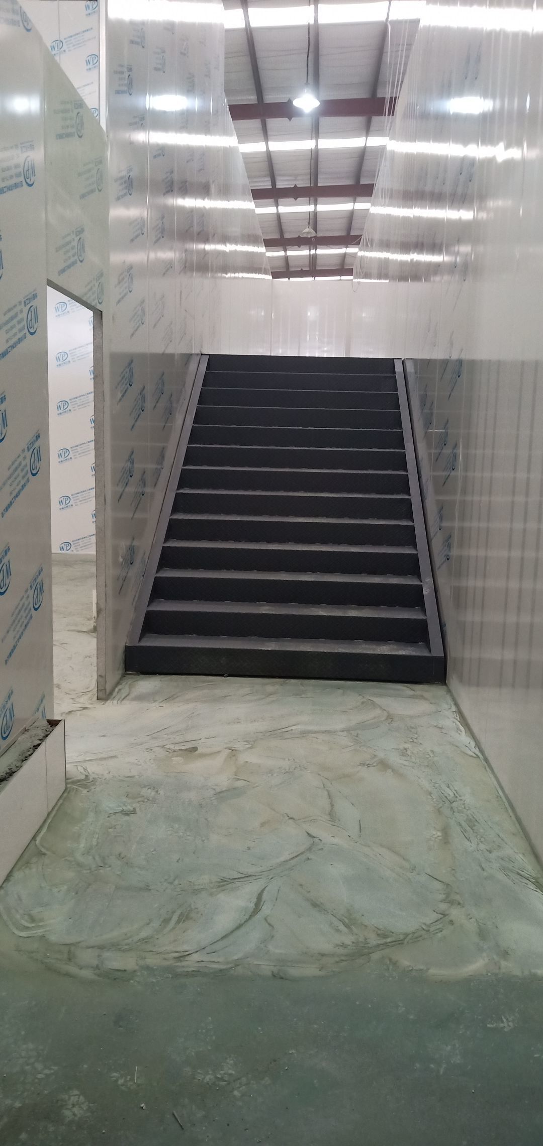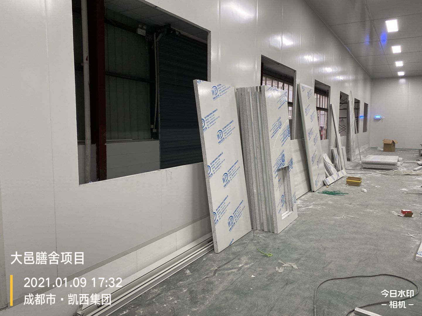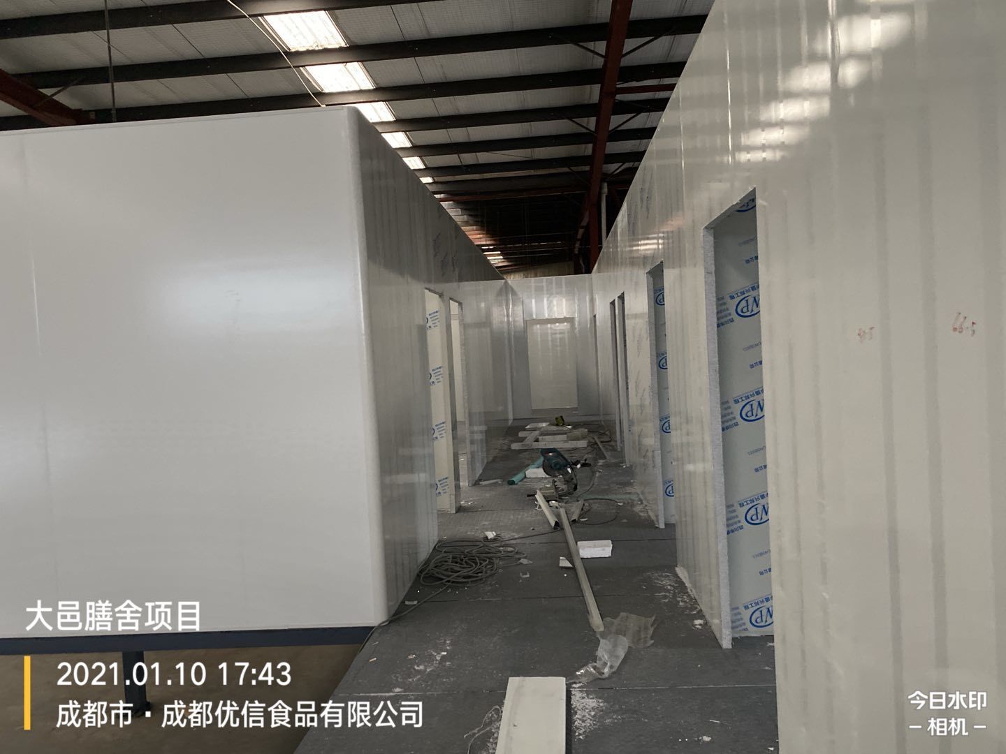 大邑膳舍食品項目:擋水墻貼磚完成90%,花紋鋼板、樓梯板到場,樓梯踏步開始焊接,彩鋼墻板立板完成5%。