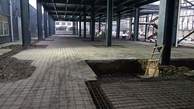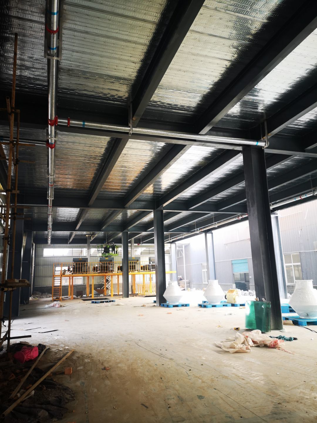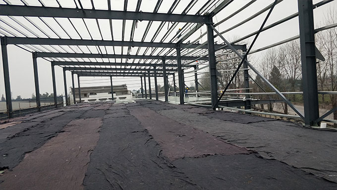 1.設備基礎完成100%;2.落水管預埋完成100%;3.屋面夾層完成30%;4.屋面檁條安裝完成100%;5.地坪鋼筋安裝完成100%;6.低洼處鋪石子完成