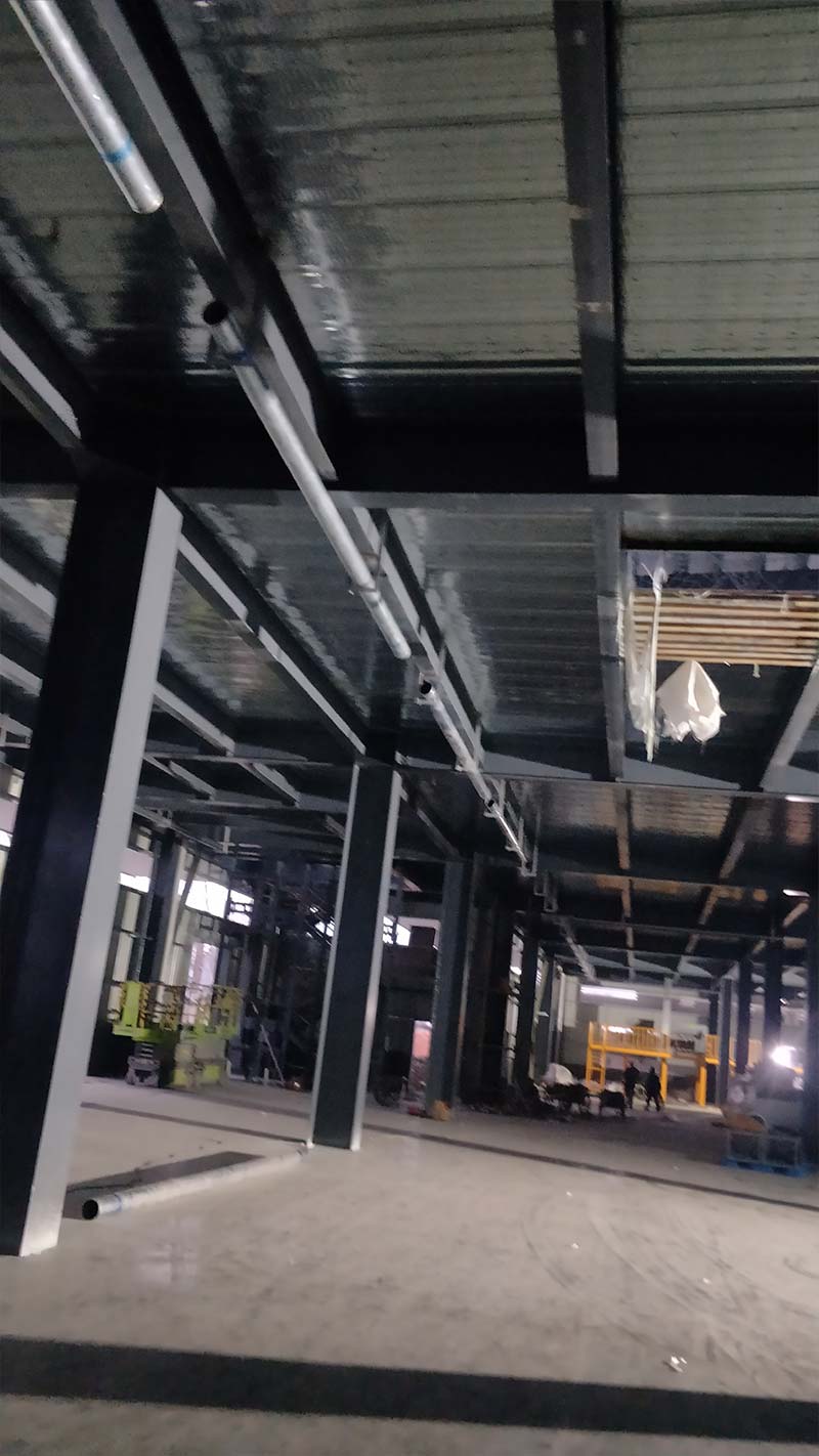 1.二層樓板混凝土完成100%;2.樓板鋼筋綁扎完成100%;3.墻檁條安裝完成20%;4.二樓水電預埋完成100%;5.二樓金剛砂完成30%