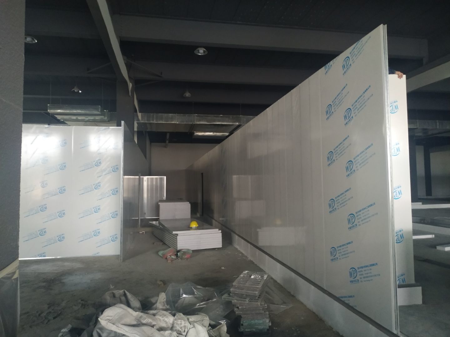 防火隔斷墻上門洞開孔完成,彩鋼墻窗戶開孔完成,門料預制,撕膜打膠,彩鋼板材料到場。