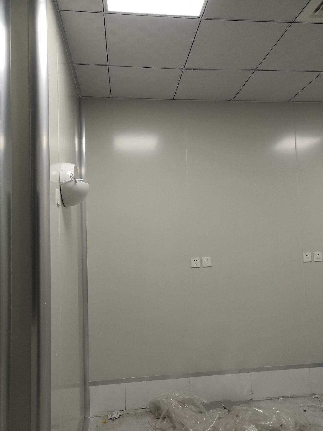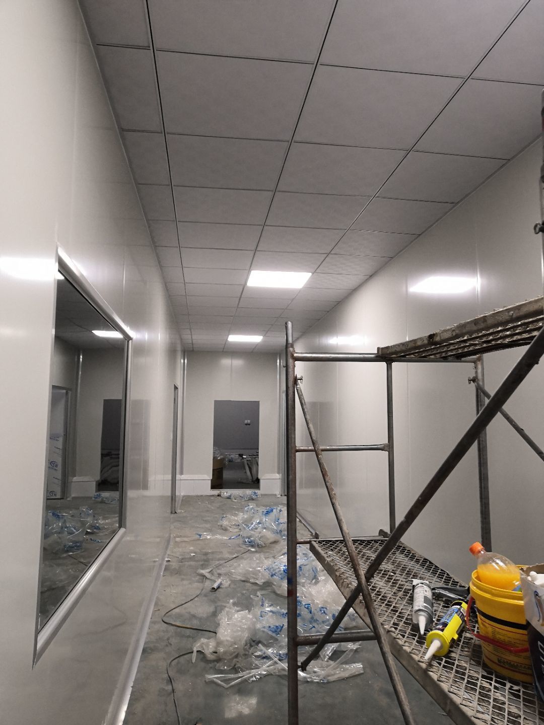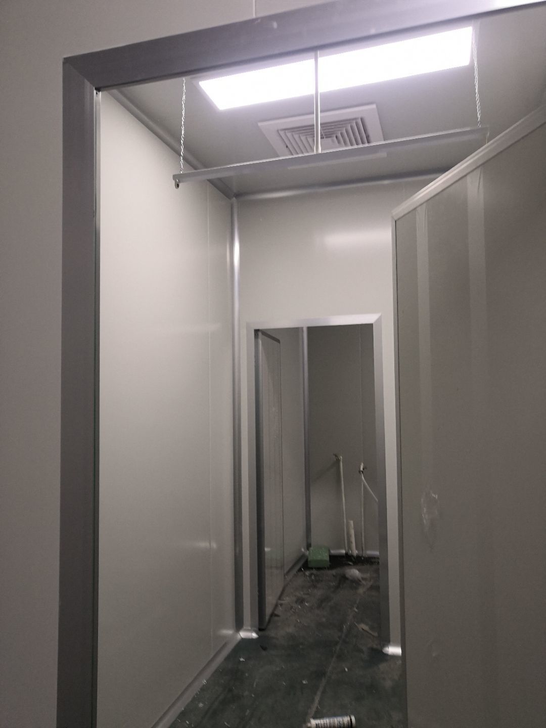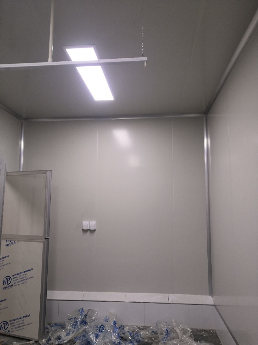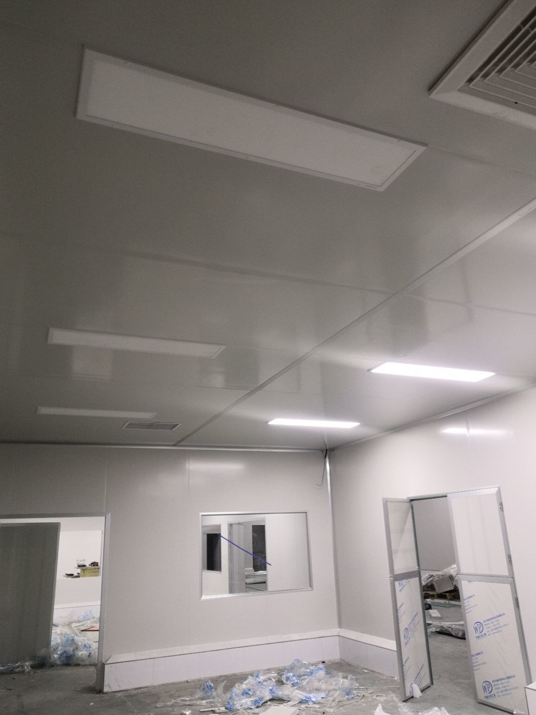 1.打膠,拍圓弧,做風淋室,裝觀察窗 2.吊三防板 3.三防板裝燈,開關,插座