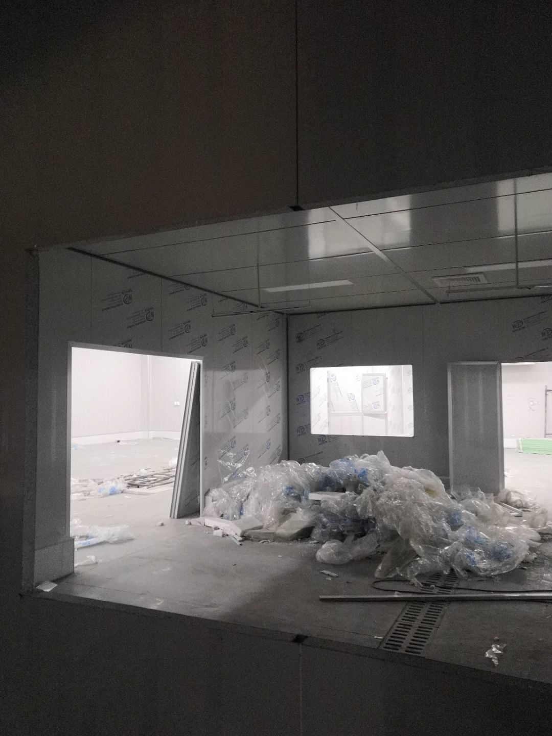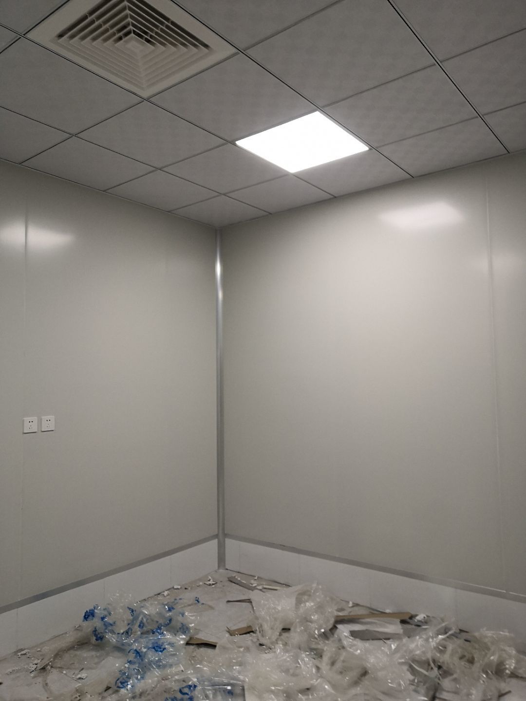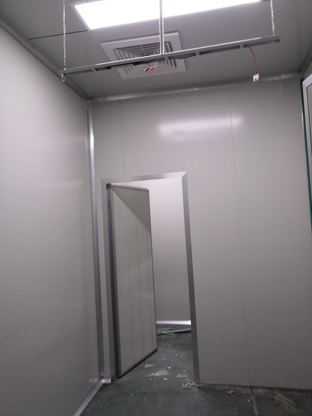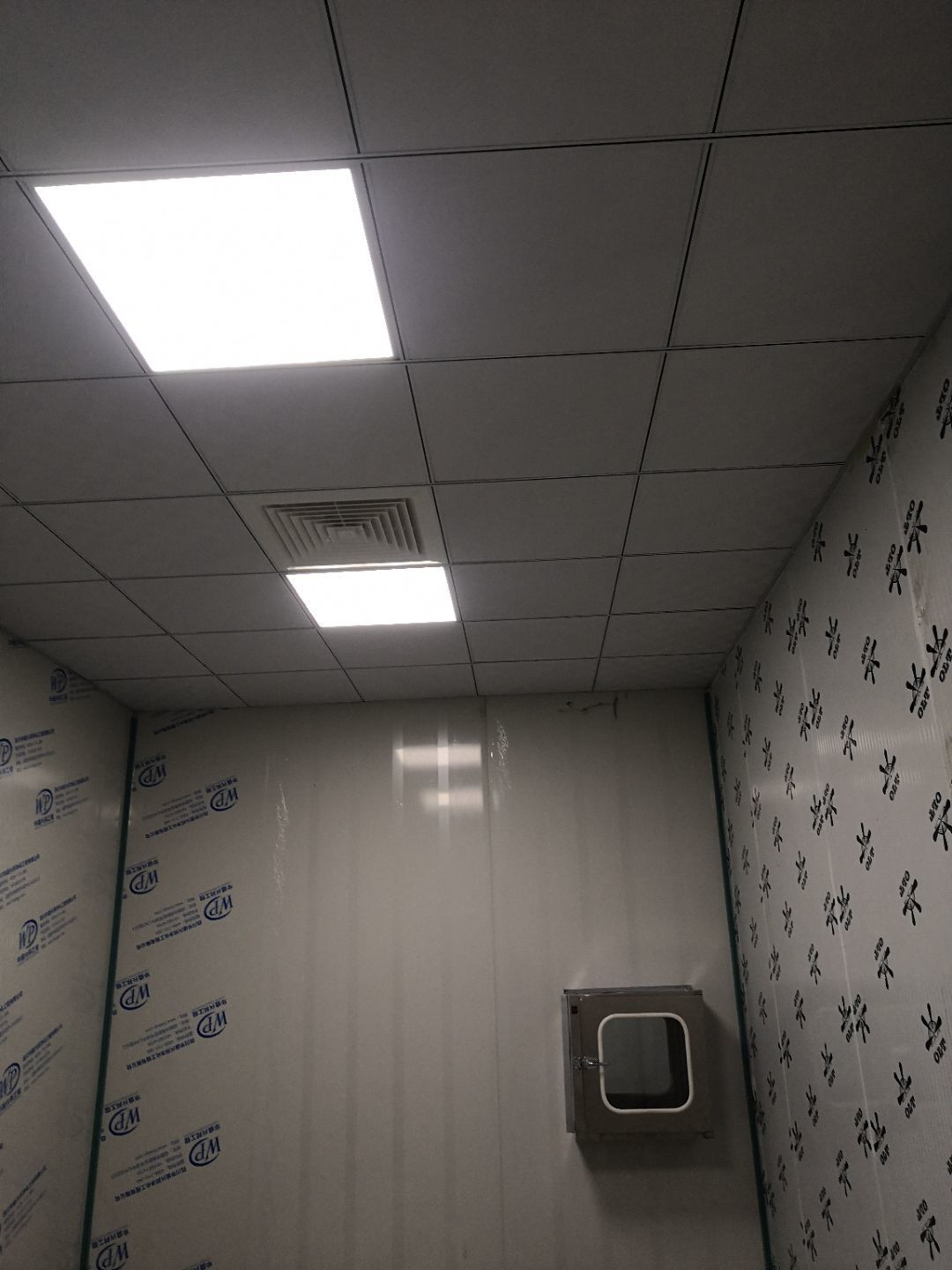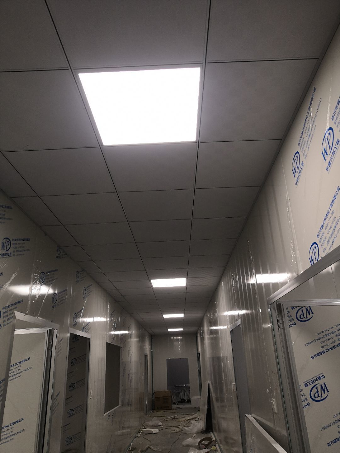 1.打膠,拍圓弧,做風淋室,裝觀察窗 2.吊三防板 3.三防板裝燈,開關,插座