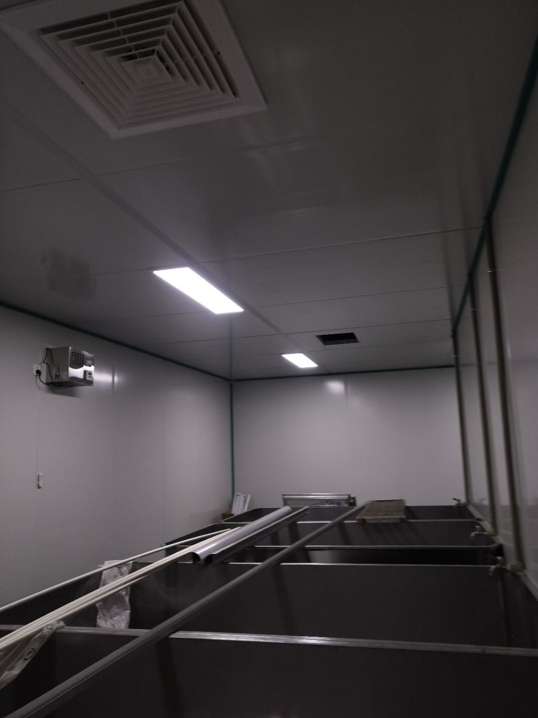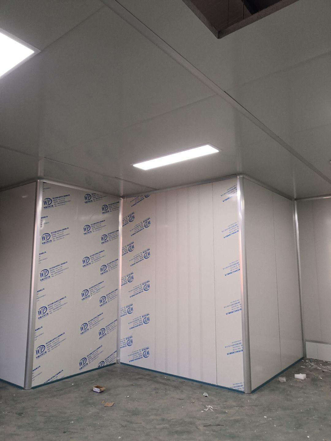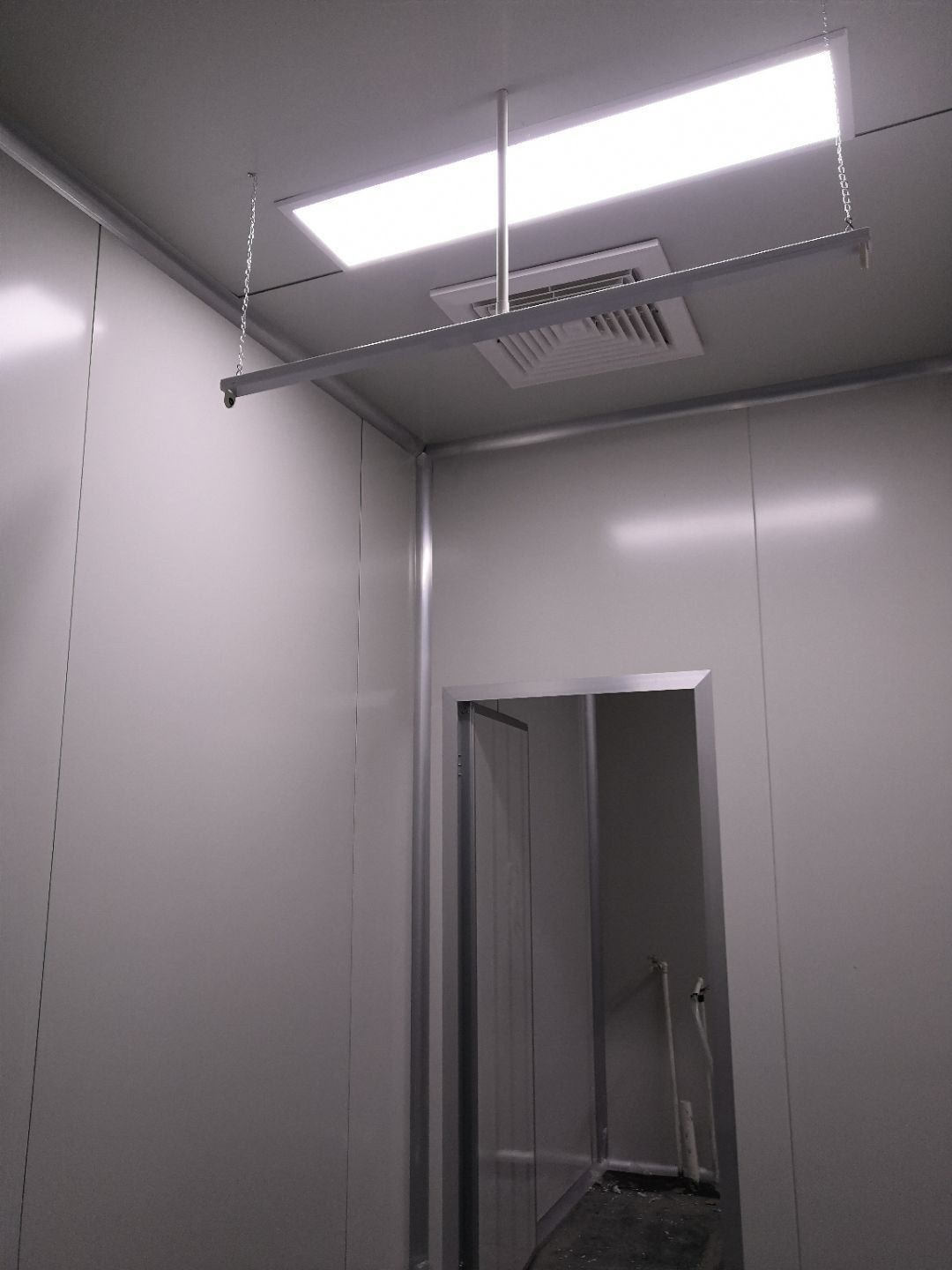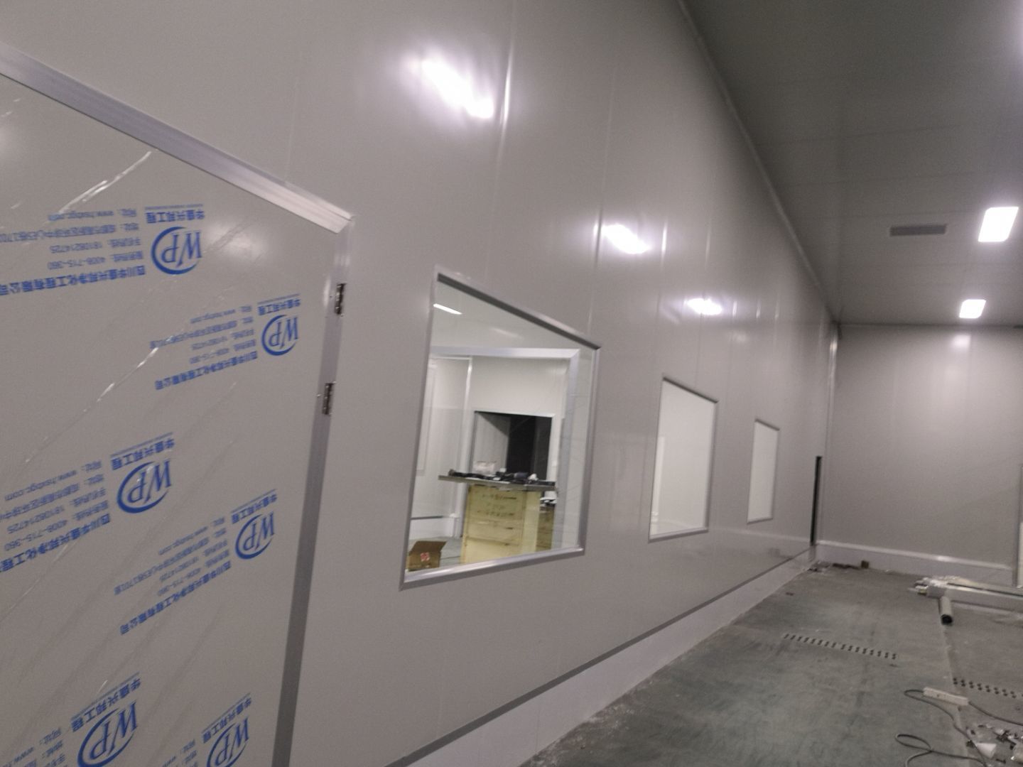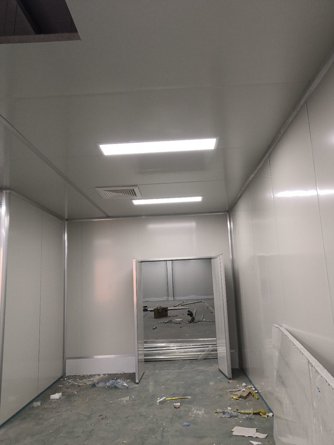 1.打膠,拍圓弧,做風淋室,裝觀察窗 2.吊三防板 3.三防板裝燈,開關,插座