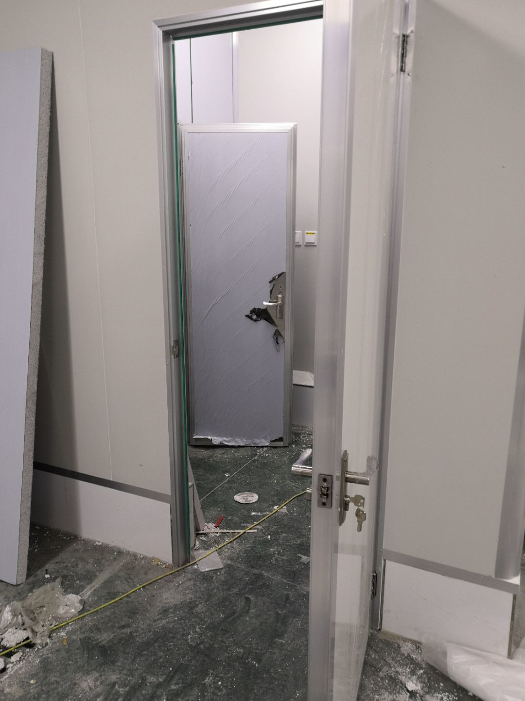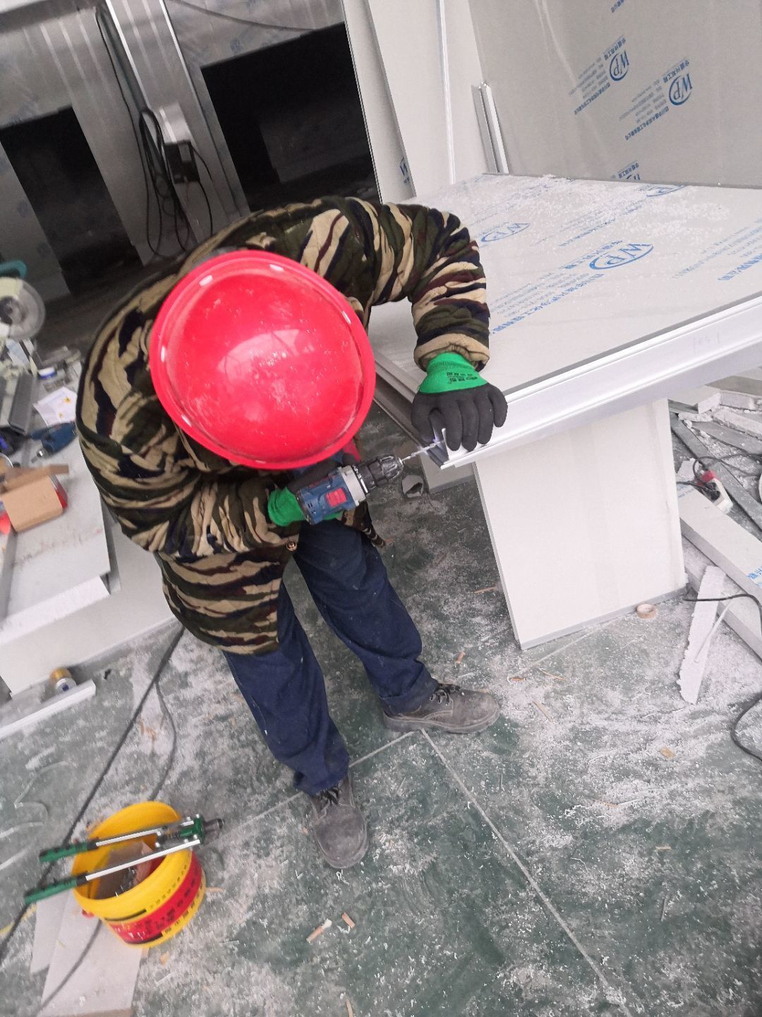 1.掛吊筋T鋁施工,墻體打膠條,做門裝門 2.收拾邊角