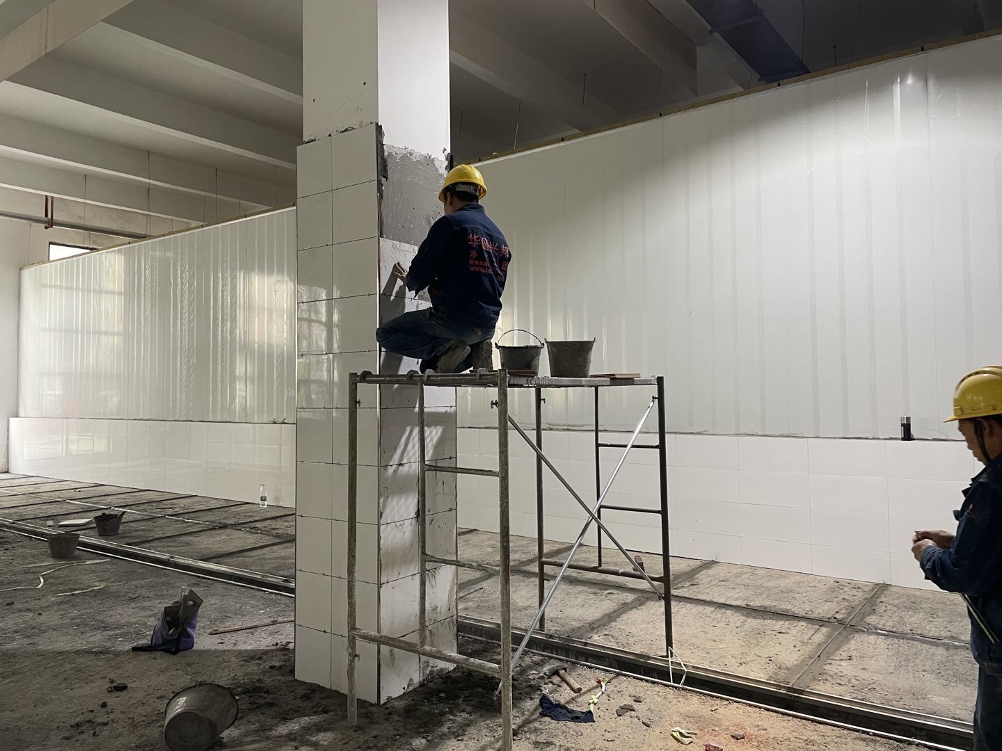 四川鮮美滋食品有限公司廠房裝修現場:1、擋水墻抹灰完成百分之30。 2、水磨石地面抓毛完成百分之35。