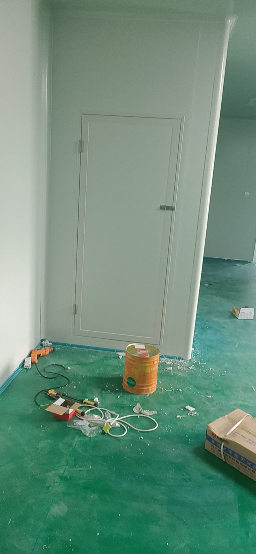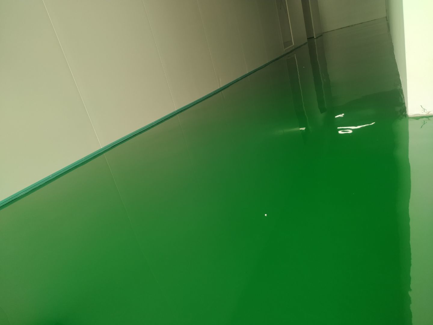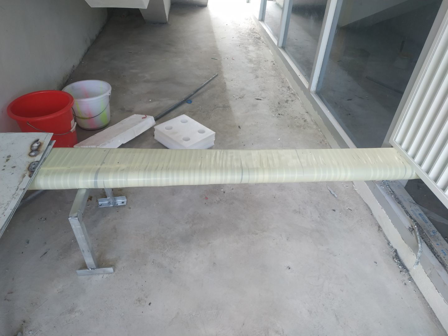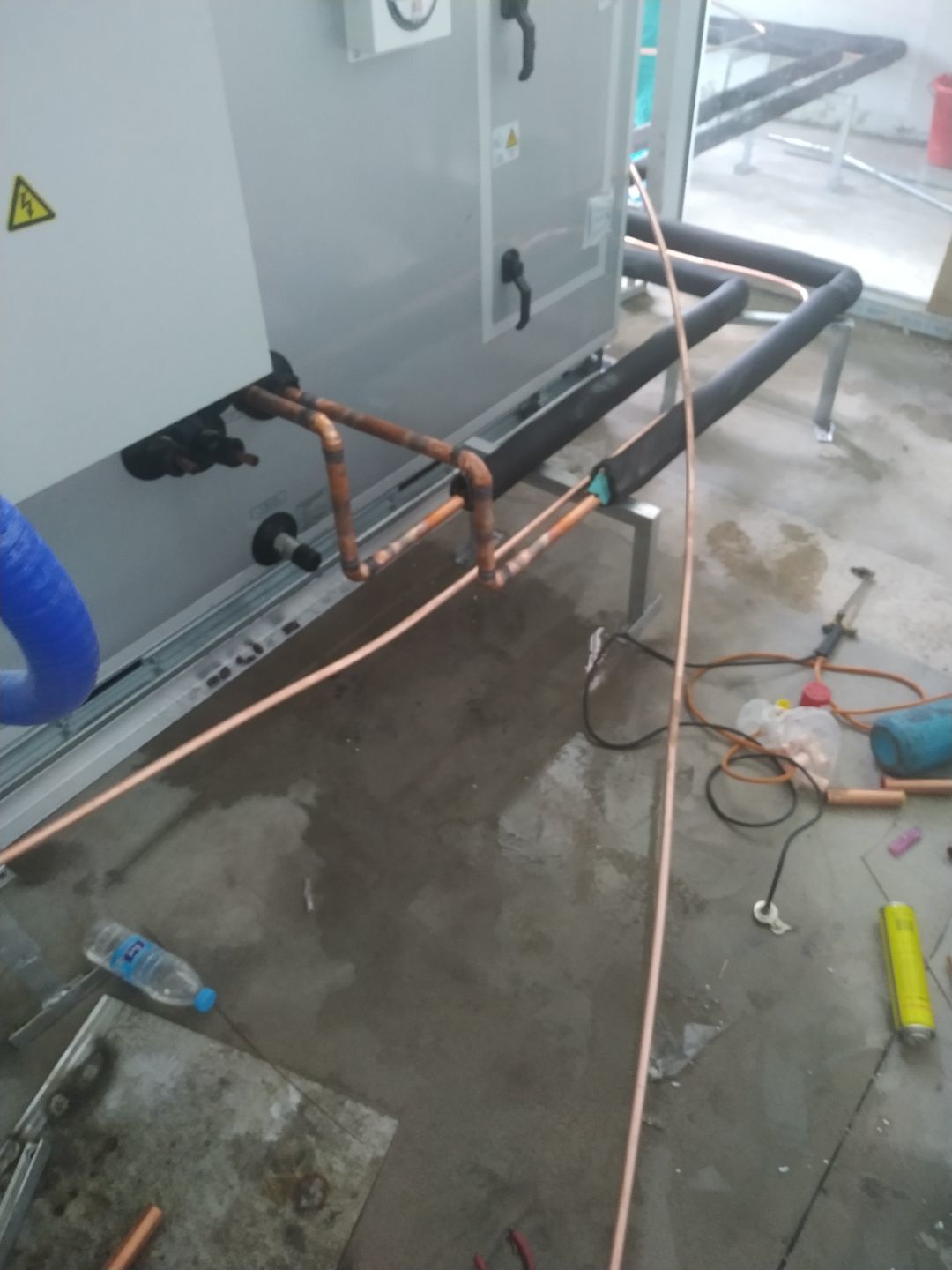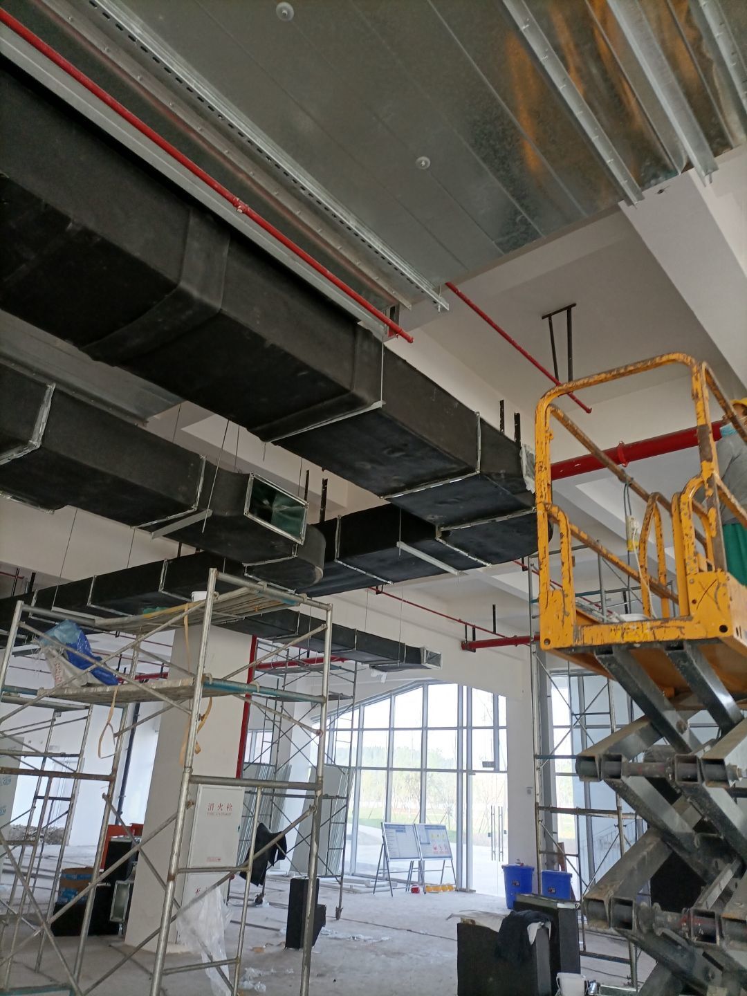 風(fēng)管安裝完成,銅管焊接完成,銅管保溫完成,環(huán)氧自流平地坪施工完成。