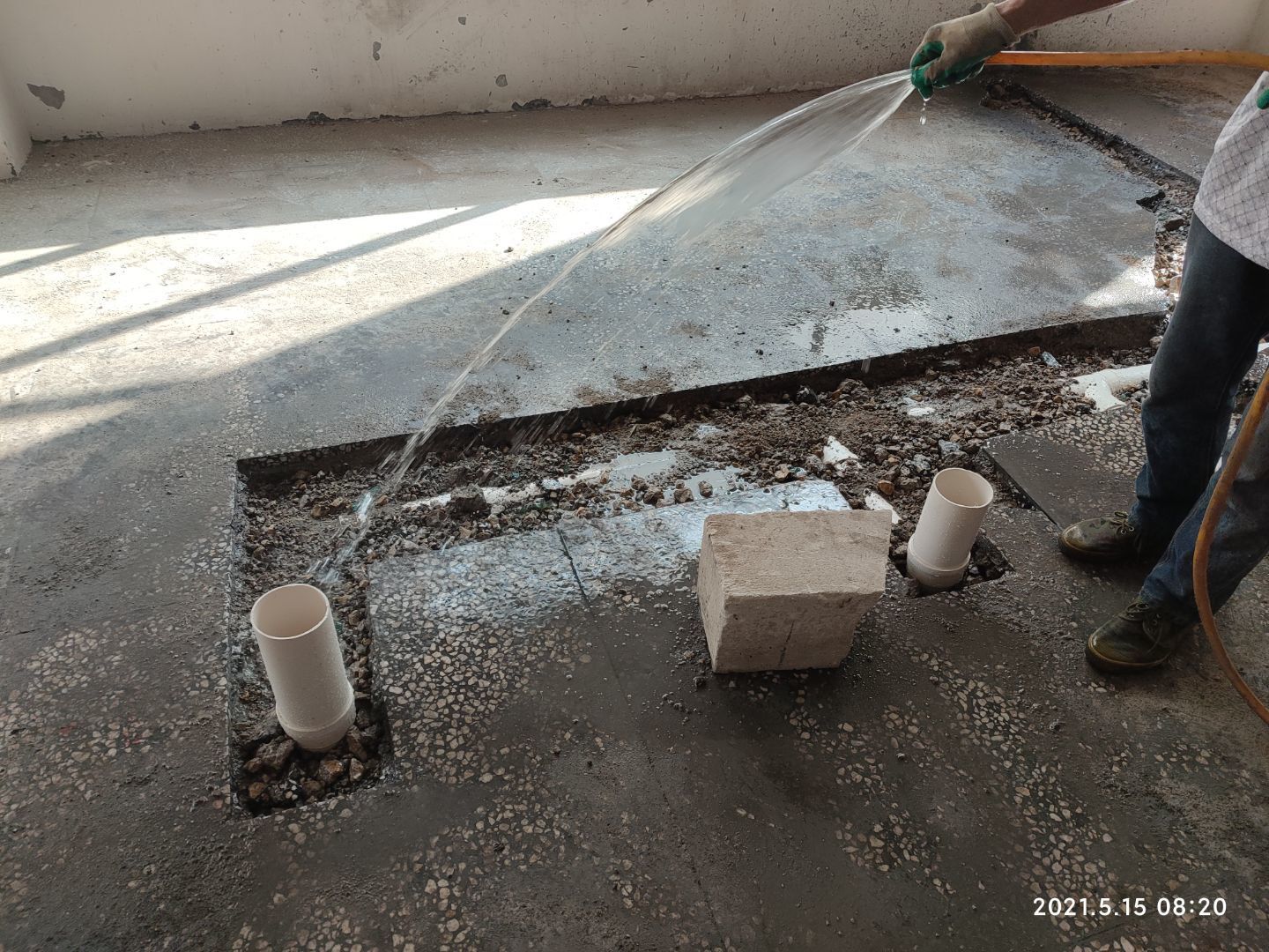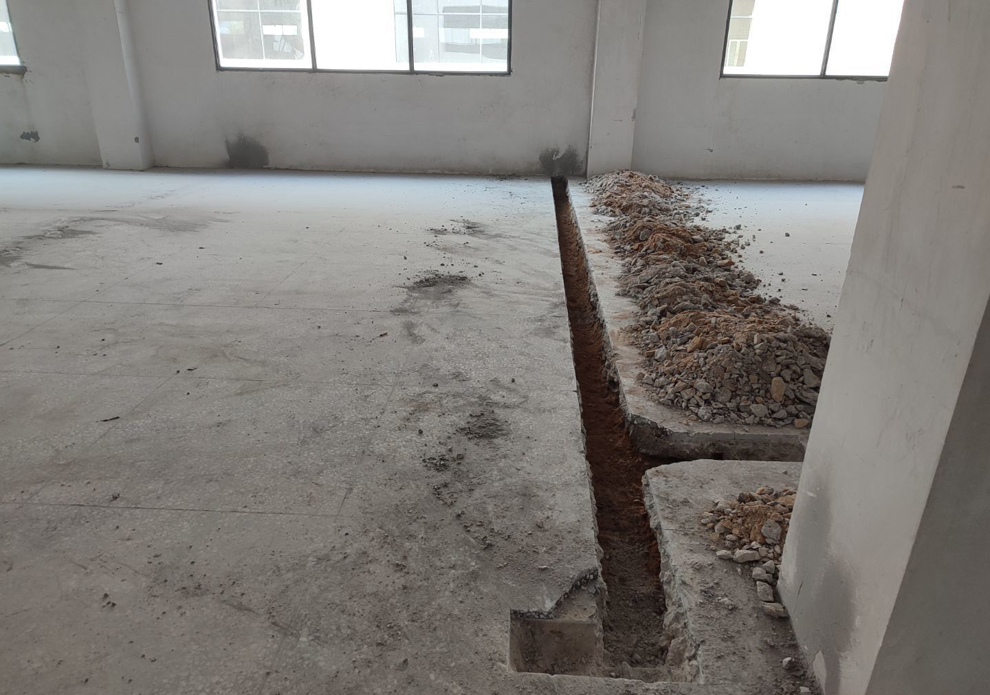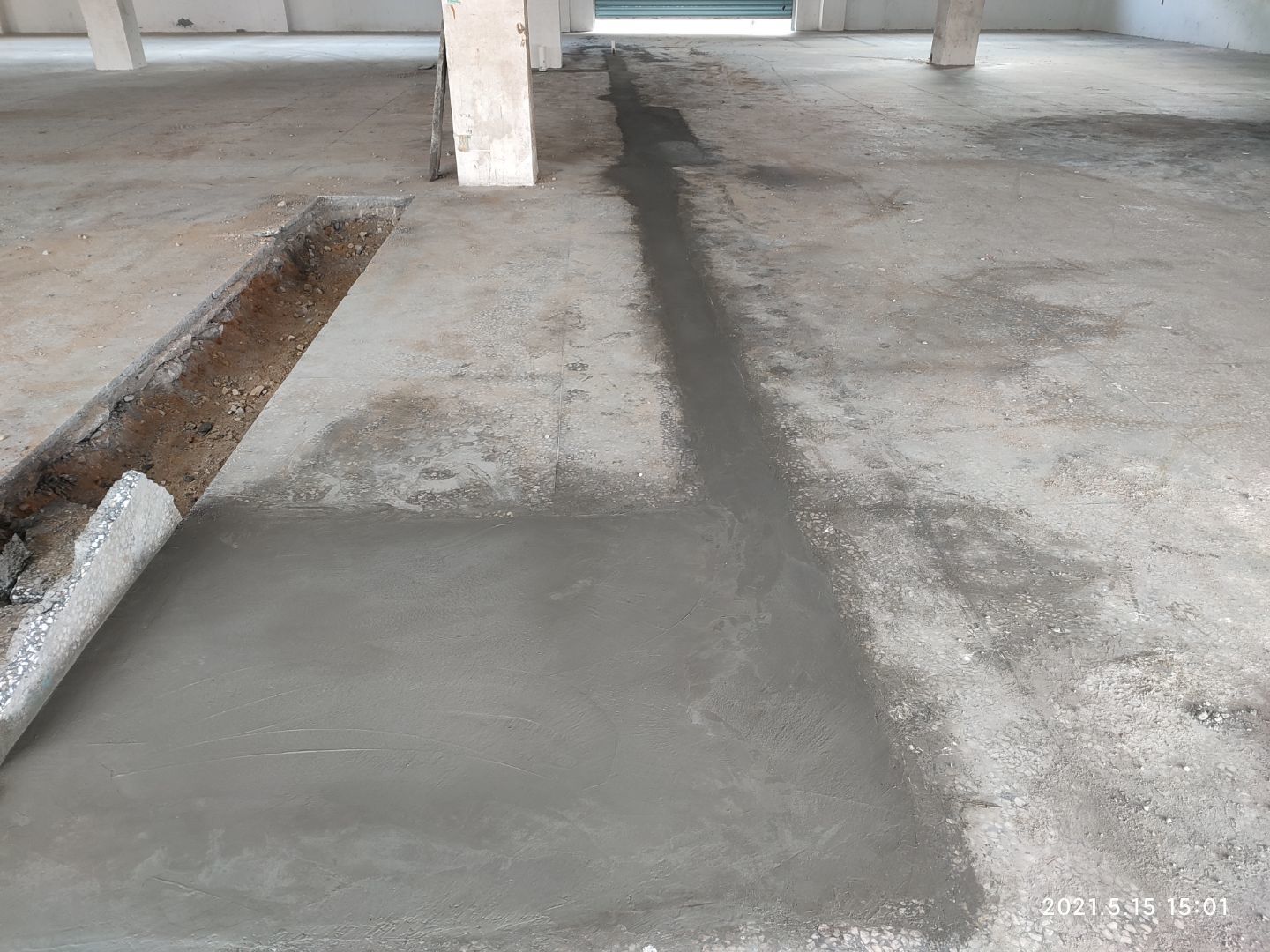 1.排水管溝回填及細石混凝土找補完成,車間坑洼補爛完成; 2.擋水墻放線完成,止水帶切割完成。