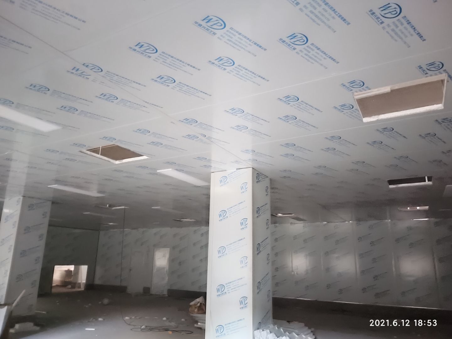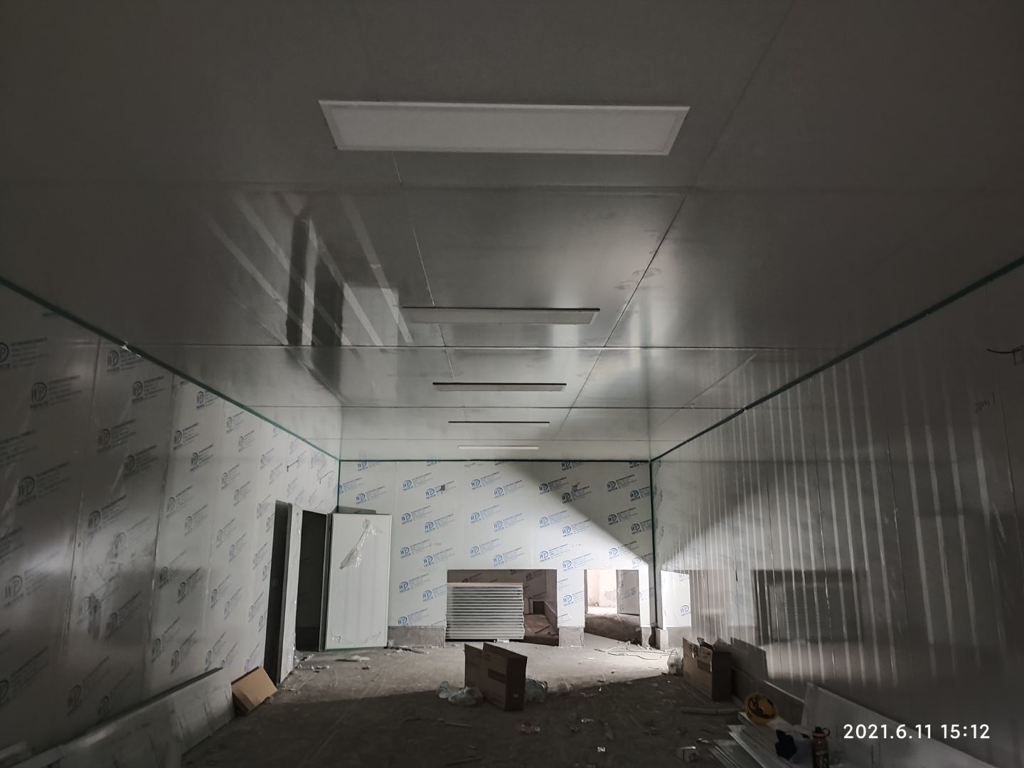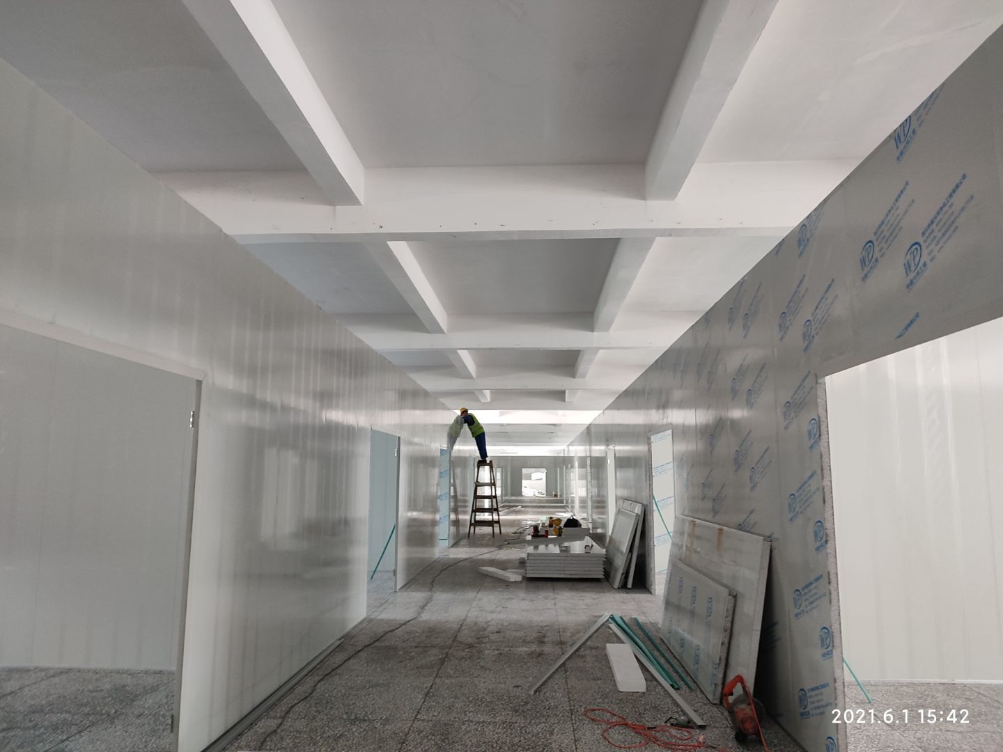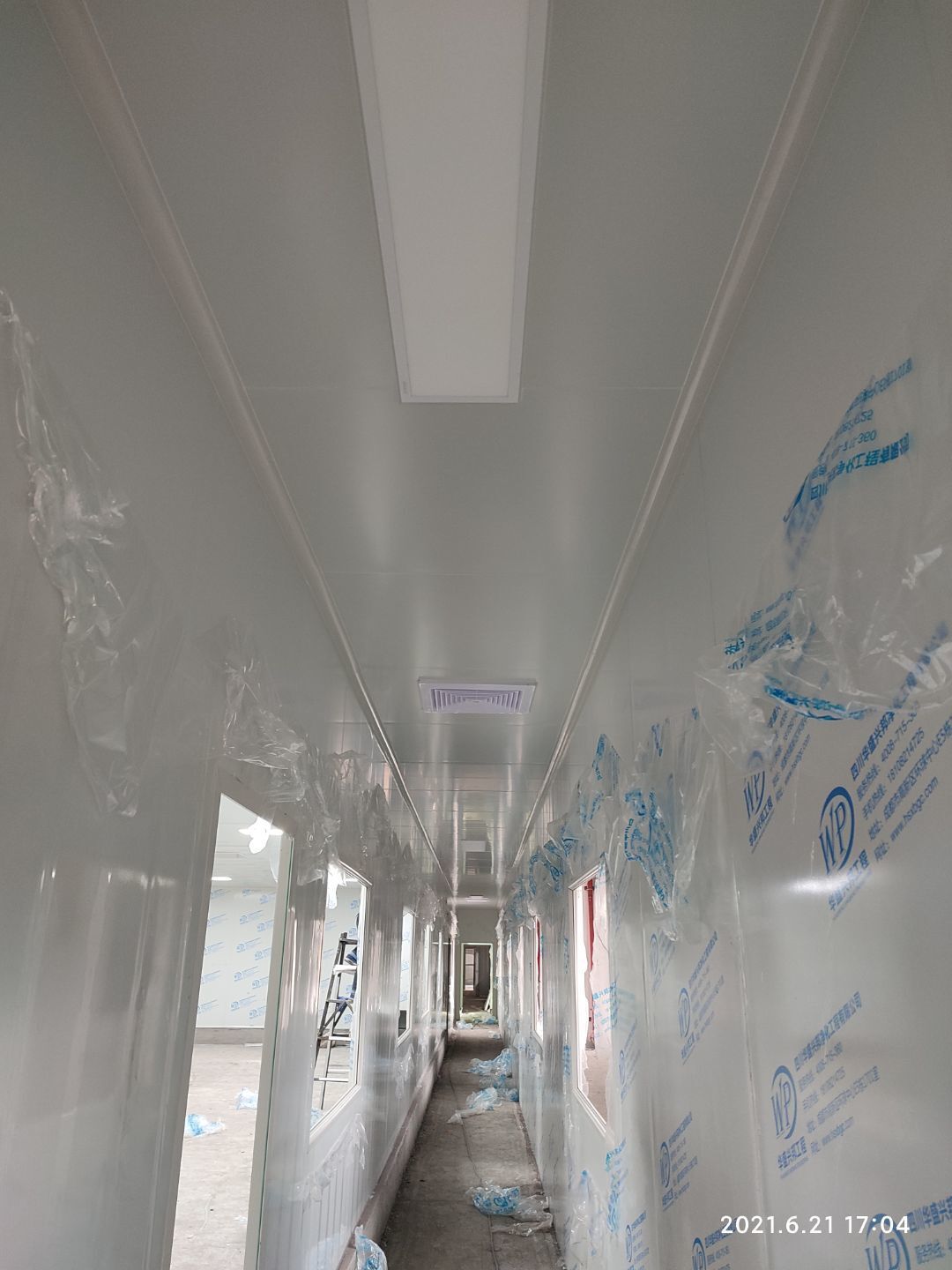 1.頂板撕膜打膠完成35% 2.彩鋼板區域換氣扇安裝完成70% 3.門鎖安裝完成70%