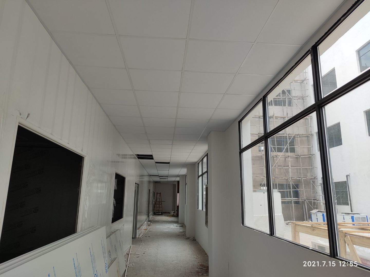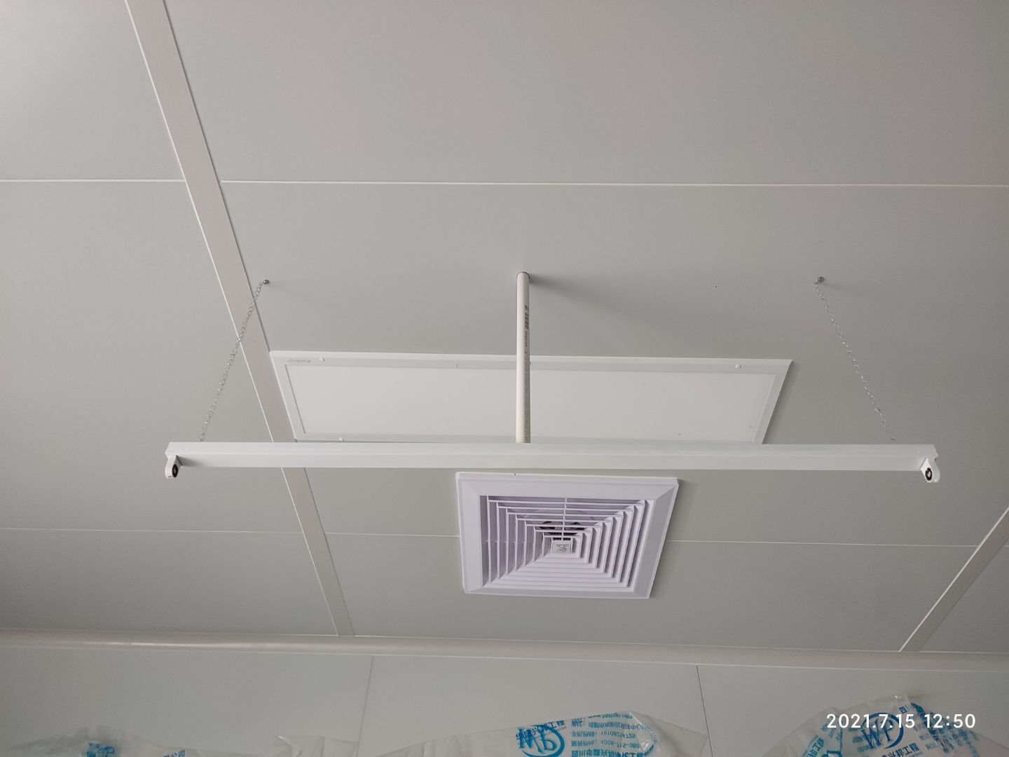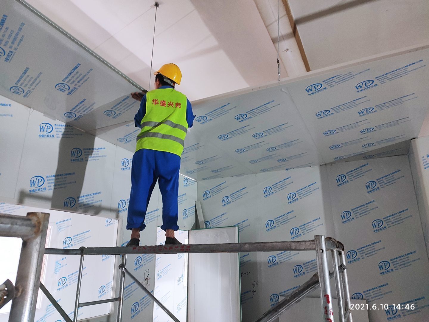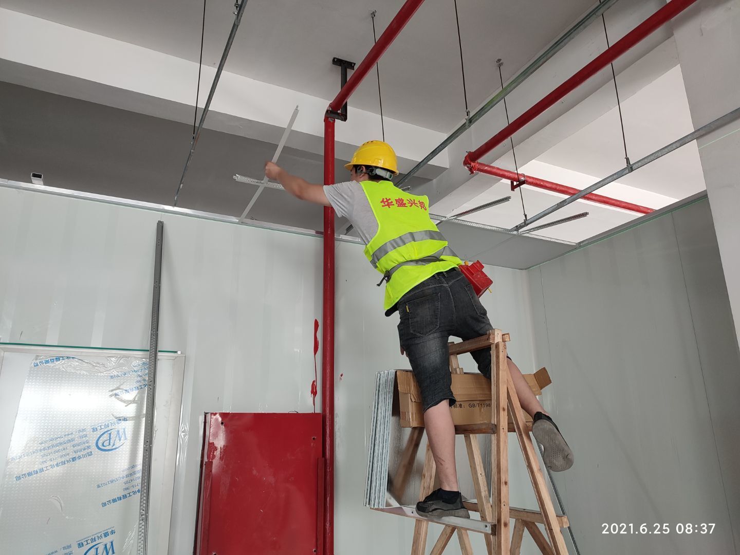 1.頂板撕膜打膠完成35% 2.彩鋼板區域換氣扇安裝完成70% 3.門鎖安裝完成70%