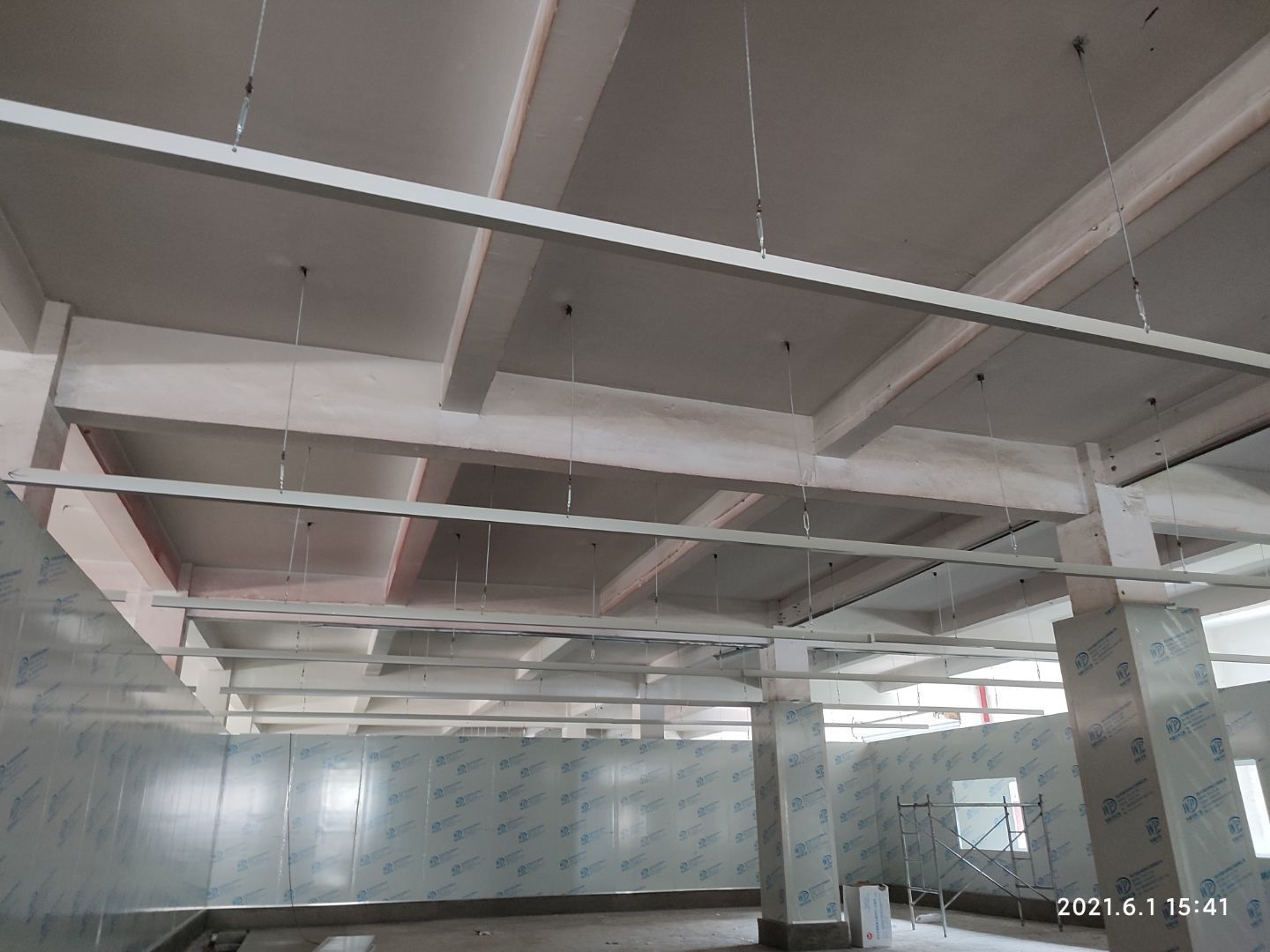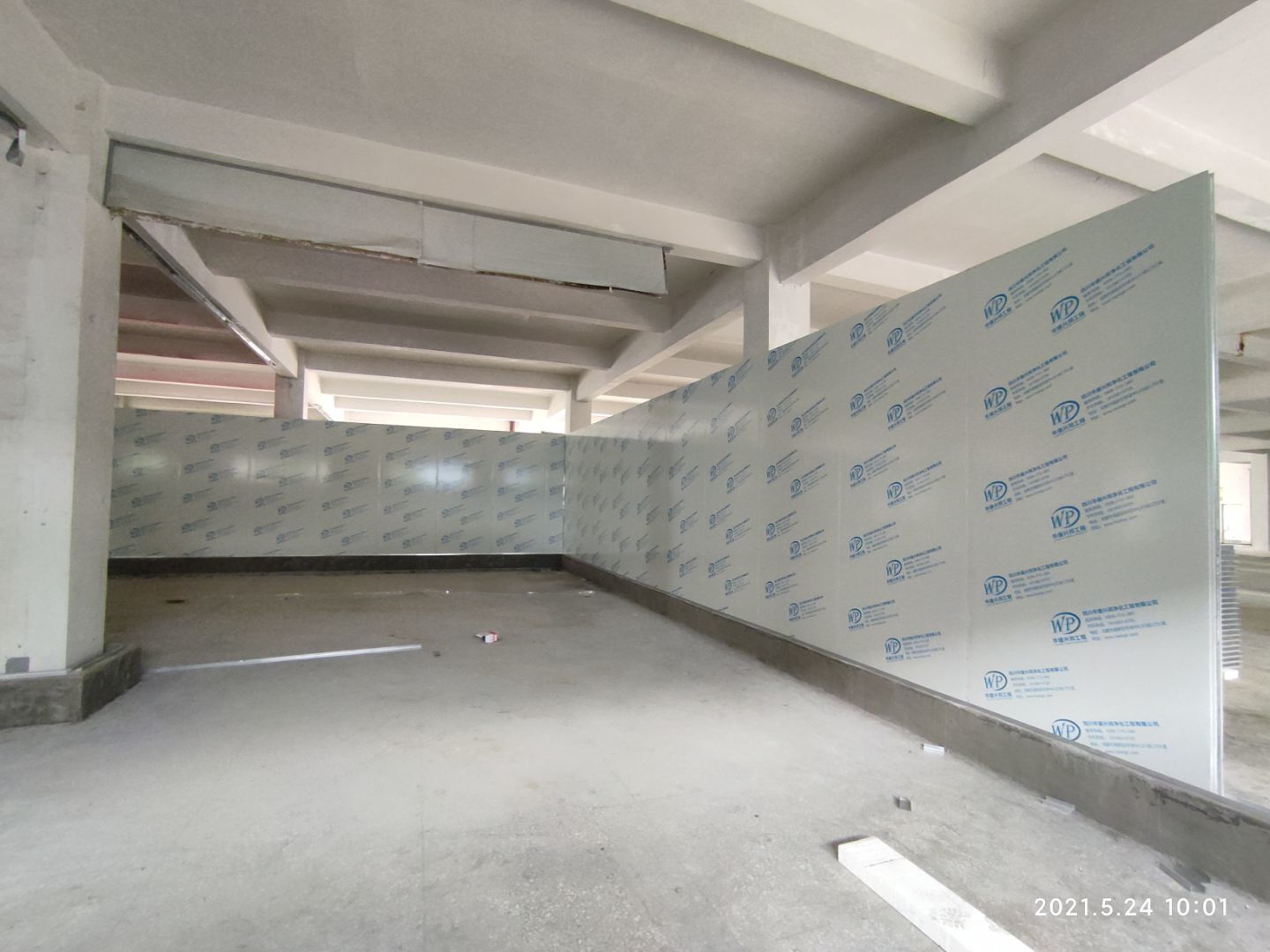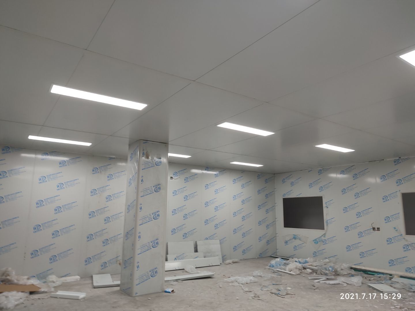1.彩鋼板頂板完成65% 2.電氣穿管布線完成35%,燈具安裝完成30% 3.圓弧完成15% 4.高效送風口開洞完成50%