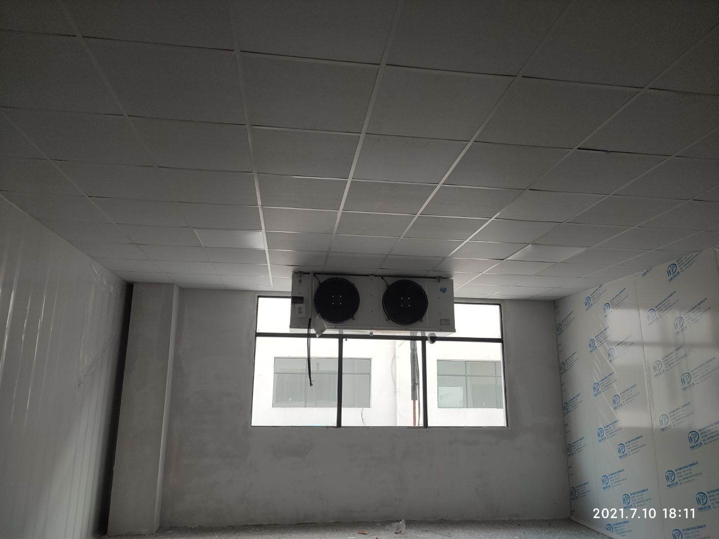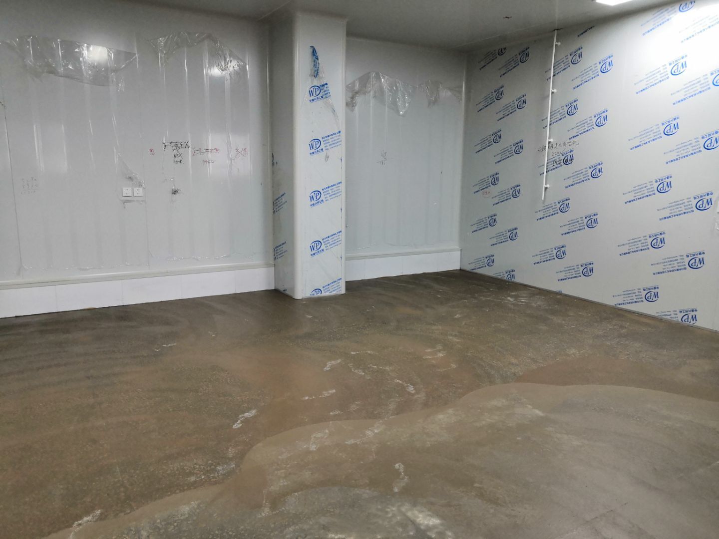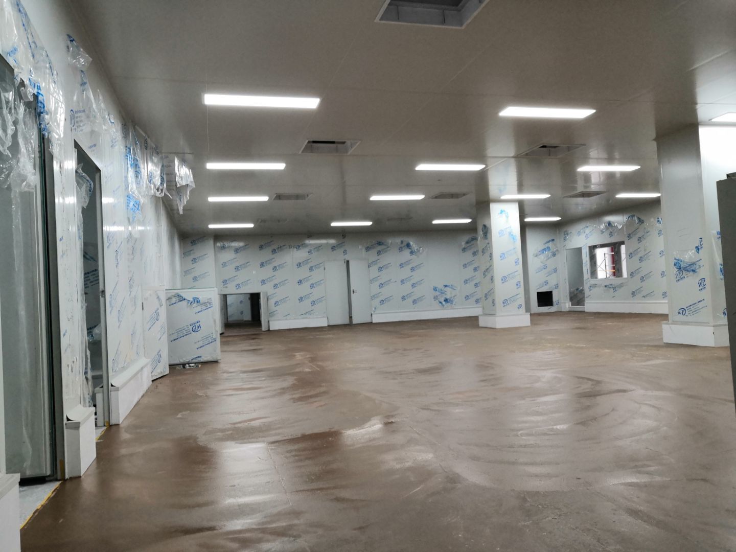 1.凍庫空調銅管焊接和保溫,控制線安裝完成,保壓完成,冷凝水管完成。 3.瓷磚鋪貼完成90%; 4.刮墻面頭道膩子完成75%