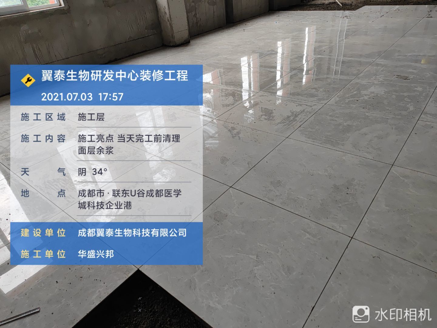 1.地磚施工人員,完成面積約30平; 2.砌體抹灰施工,衛生間包排水管 抹灰完成1/3