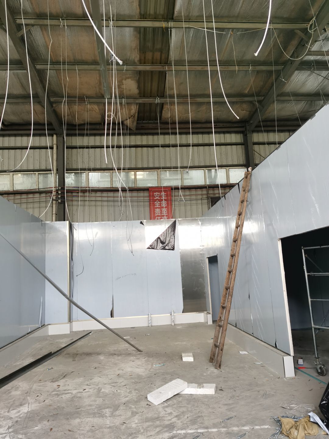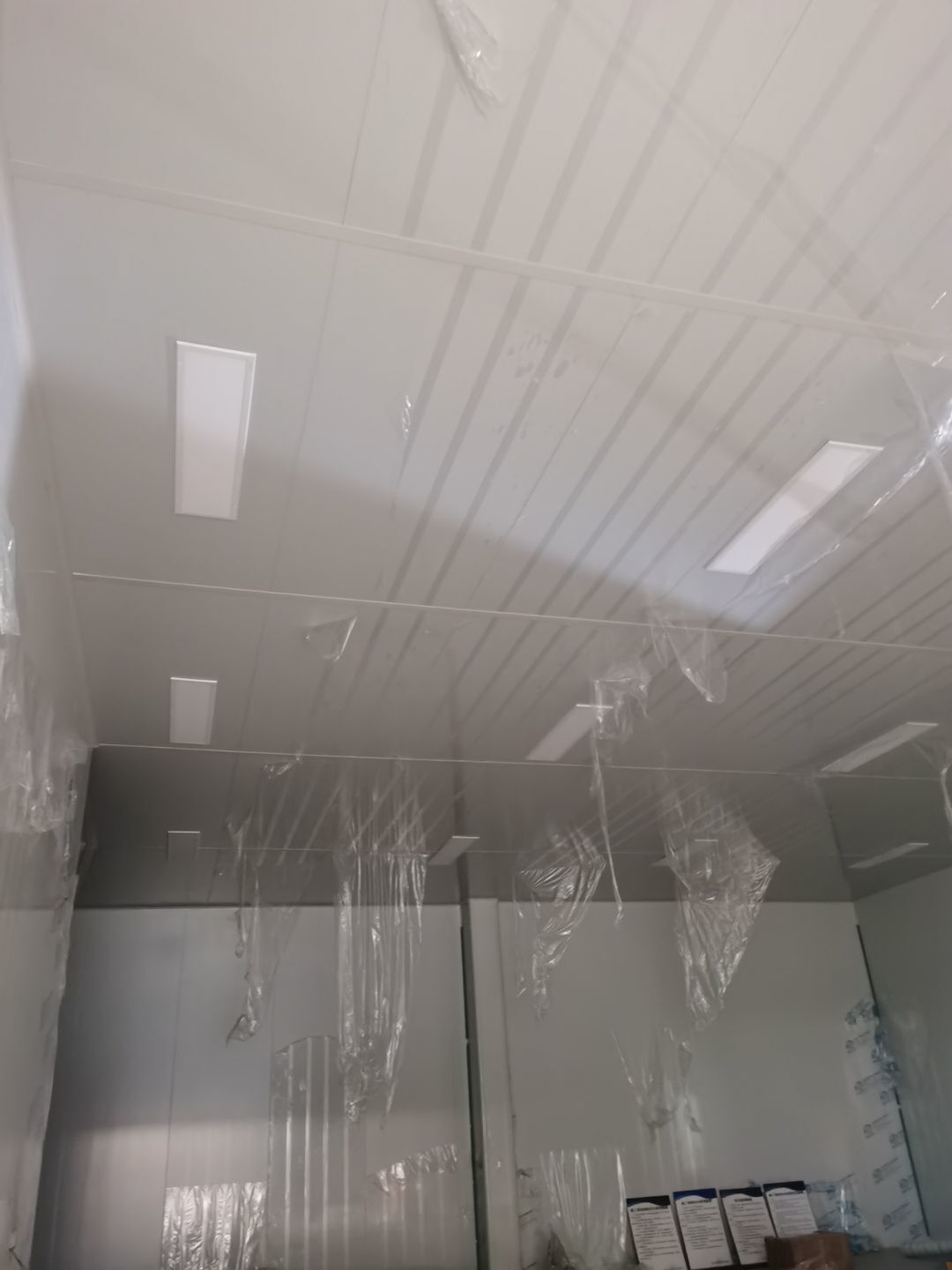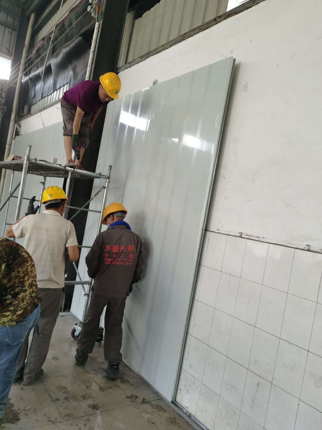 1,彩鋼墻板立板除預留設備外完成100% 2,彩鋼板吊頂除預留外,完成95% 3,三防板吊頂完成100% 4,水電安裝完成60% 5,彩鋼板收尾工作完成30%