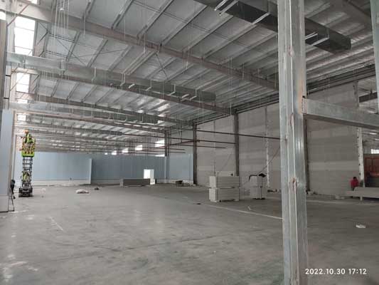 1,彩鋼板隔墻完成90%,頂板完成70% 2,固化地坪完成80% 3,照明及插座底座安裝完成50%,穿管穿線完成15%,換氣扇定位完成40%,燈具安裝30% 4,風管安裝完成20%,空調水管除銹刷漆完成80%
